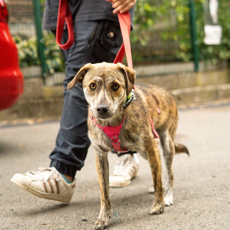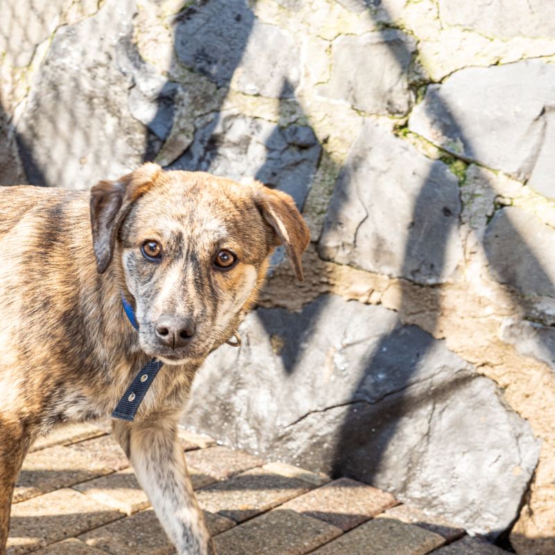 Menschen begegnet Crispy noch mit Zurückhaltung und Angst – vor allem in neuen Situationen. Doch mit Zeit und Geduld taut er zunehmend auf und zeigt, dass in ihm ein neugieriger und lernwilliger junger Hund steckt.