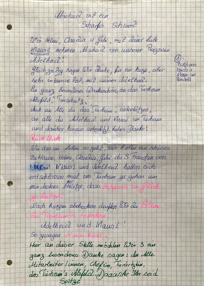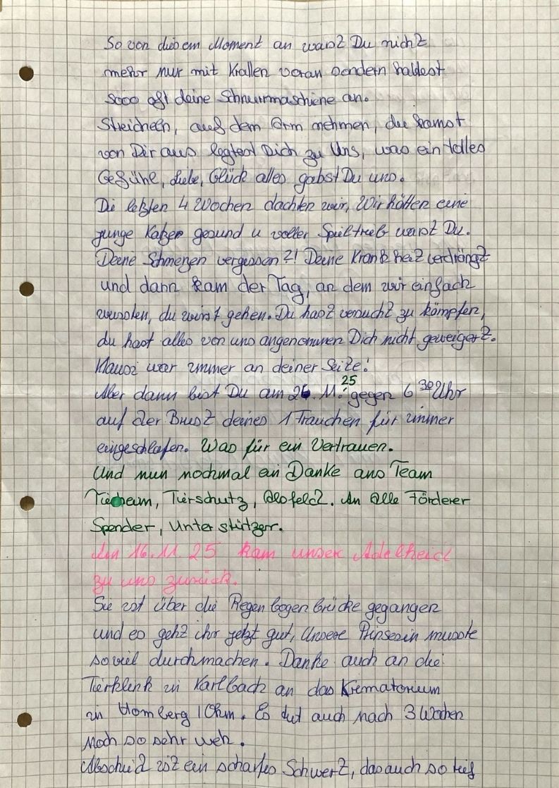 Das Tierheim und das gesamte Team nehmen Abschied von Adelheid. In dankbarer Erinnerung an sie und mit dem Wissen, dass sie noch einmal ein schönes Zuhause hatte.