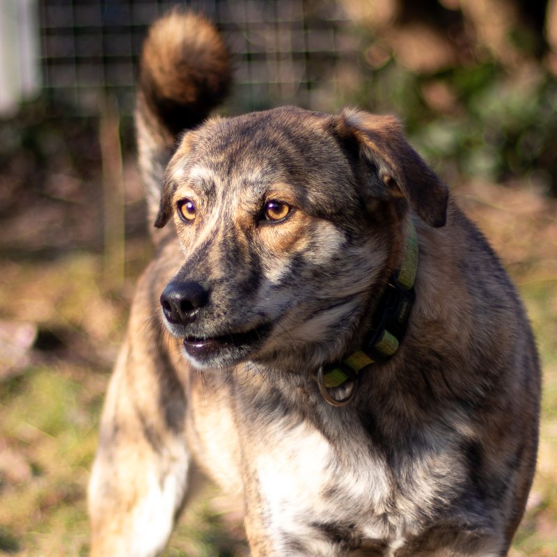 Menschen begegnet Crispy noch mit Zurückhaltung und Angst – vor allem in neuen Situationen. Doch mit Zeit und Geduld taut er zunehmend auf und zeigt, dass in ihm ein neugieriger und lernwilliger junger Hund steckt.