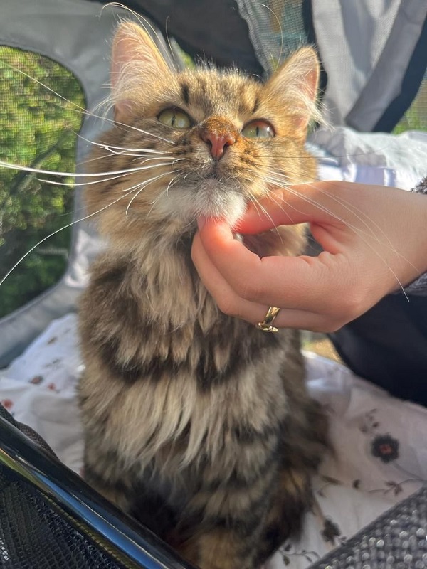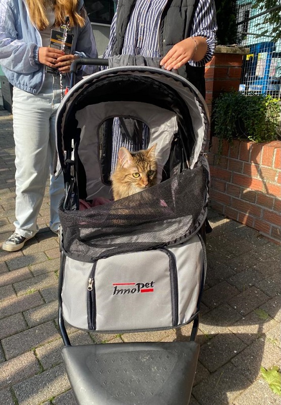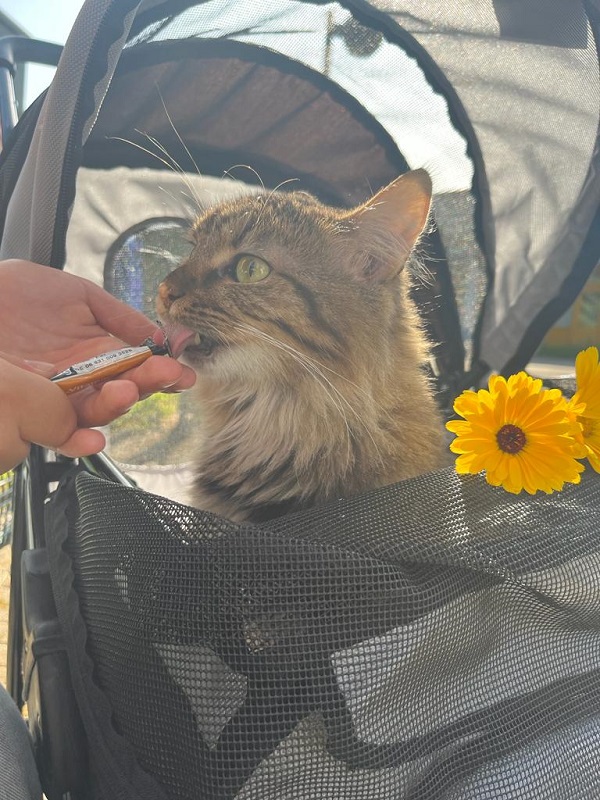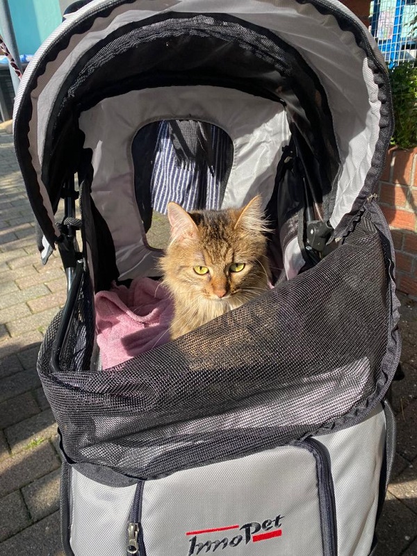 Selbst ihr Handicap (Querschnittsteillähmung) hindert sie nicht daran, die Welt zu erkunden. Denn so genoss sie am WE einen Spaziergang im Katzenbuggy! Das war sooo aufregend. Eine Leckereien-Pause durfte natürlich auch nicht fehlen (Video in den Kommentaren). Prinzessin beobachtete alles ganz genau und sammelte viele neue Eindrücke. Hui war das spannend!