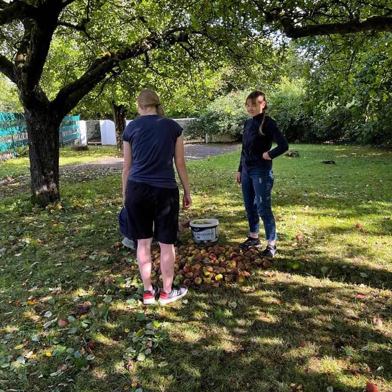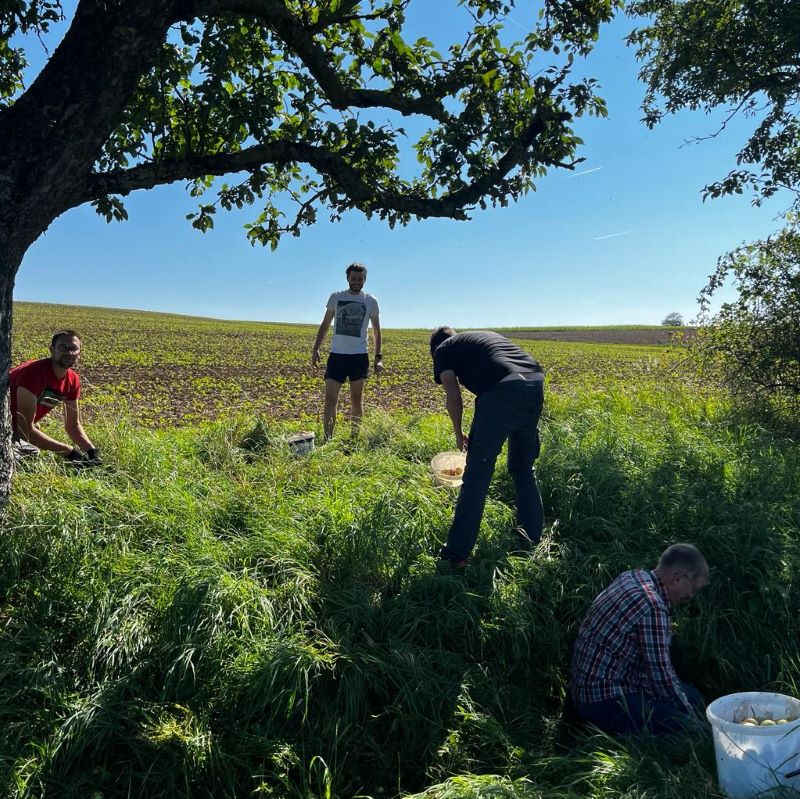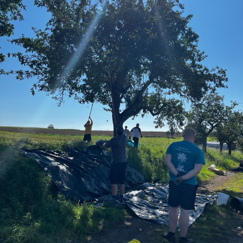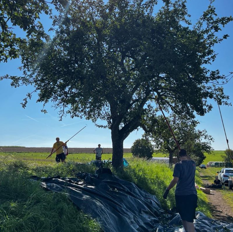 In der Gemeinde Birstein, dort wo der Ursprung der „Apfelaktion“ liegt, warteten etwa 20 Bäume auf uns. Alleine war das nicht zu schaffen, das war klar. Wir stellten eine kurze Anfrage bei dem Verein „Dalles Kicker Unterreichenbach“, ob sie Lust haben, uns bei einer Aktion für den guten Zweck zu unterstützen. Wir waren völlig begeistert: 14 Männer und Frauen sagten zu. Samstagmorgen, 8.00 Uhr, wurde in den Tag gestartet. Es gab 2 Teams, damit wir auch alles schaffen können. Um 15 Uhr war der Termin zum Pressen ausgemacht.