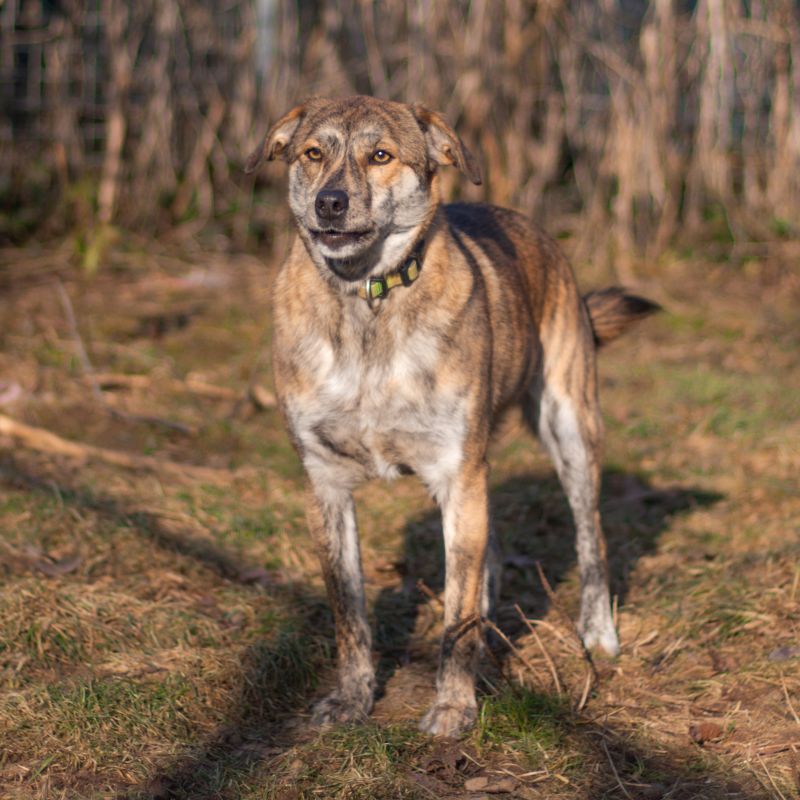 Menschen begegnet Crispy noch mit Zurückhaltung und Angst – vor allem in neuen Situationen. Doch mit Zeit und Geduld taut er zunehmend auf und zeigt, dass in ihm ein neugieriger und lernwilliger junger Hund steckt.