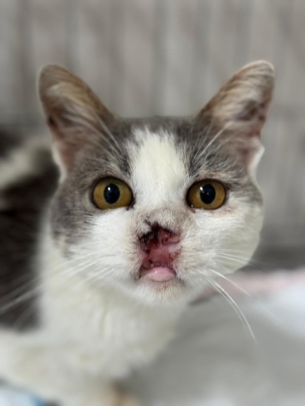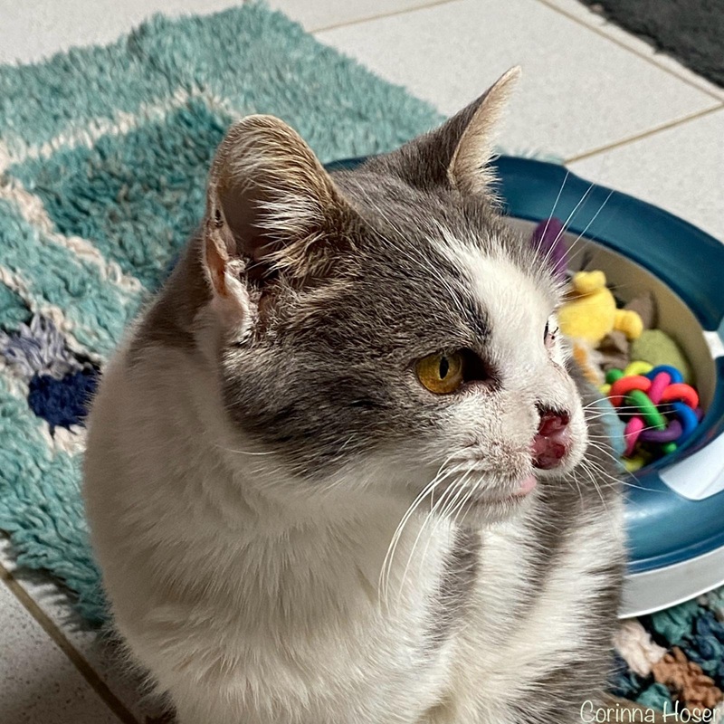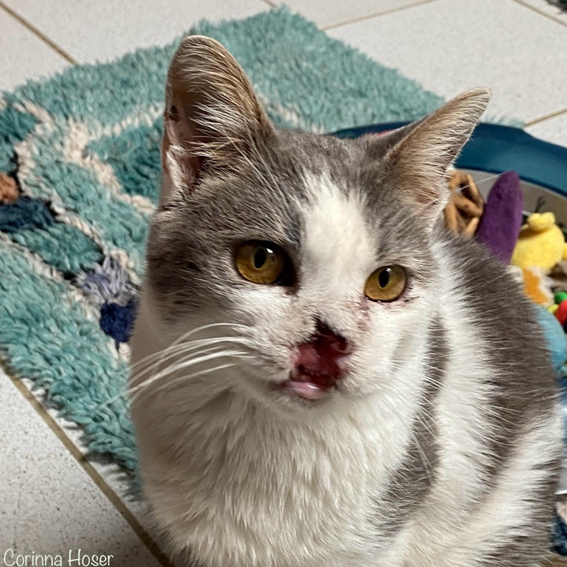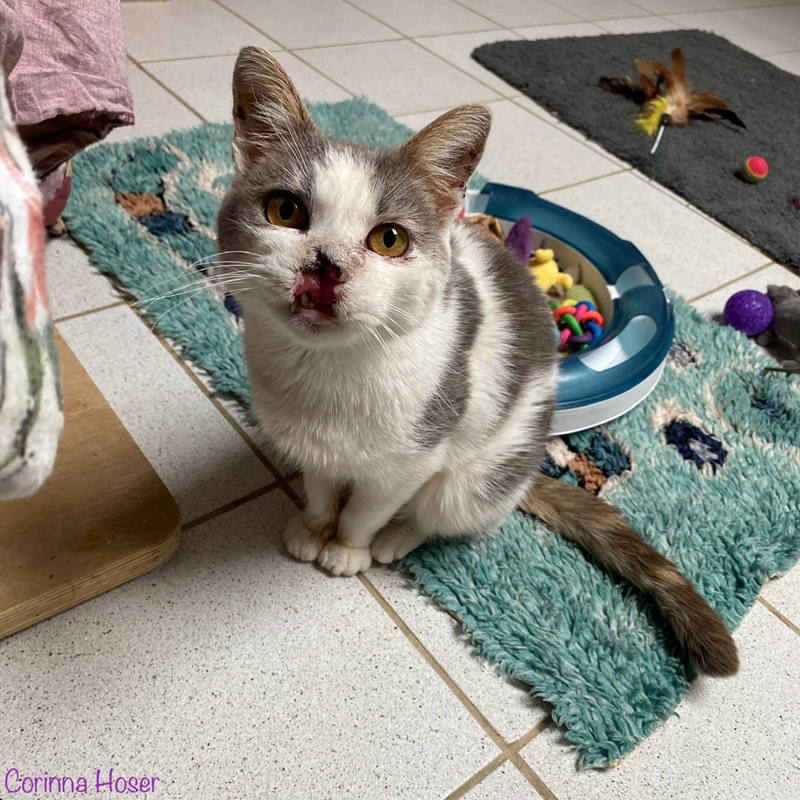 Schlürfi haben wir von unserem Partnerverein, der Tierhilfe Hoffnung, übernommen. Die liebe Katzendame sucht nun ihr End-Zuhause, was sie so nimmt wie sie ist. Auch wenn der erste Anblick vielleicht einen kurz stocken lässt, so gewöhnt man sich sehr schnell daran. Sie hat keine Probleme mit der fehlenden Nase. Sie kann fressen und auch riechen. Streicheleinheiten genießt sie und möchte gern noch viel mehr. Schlürfi möchte gern mit ihren Menschen auf einer Couch sitzen und einfach nur lieb gehabt werden.