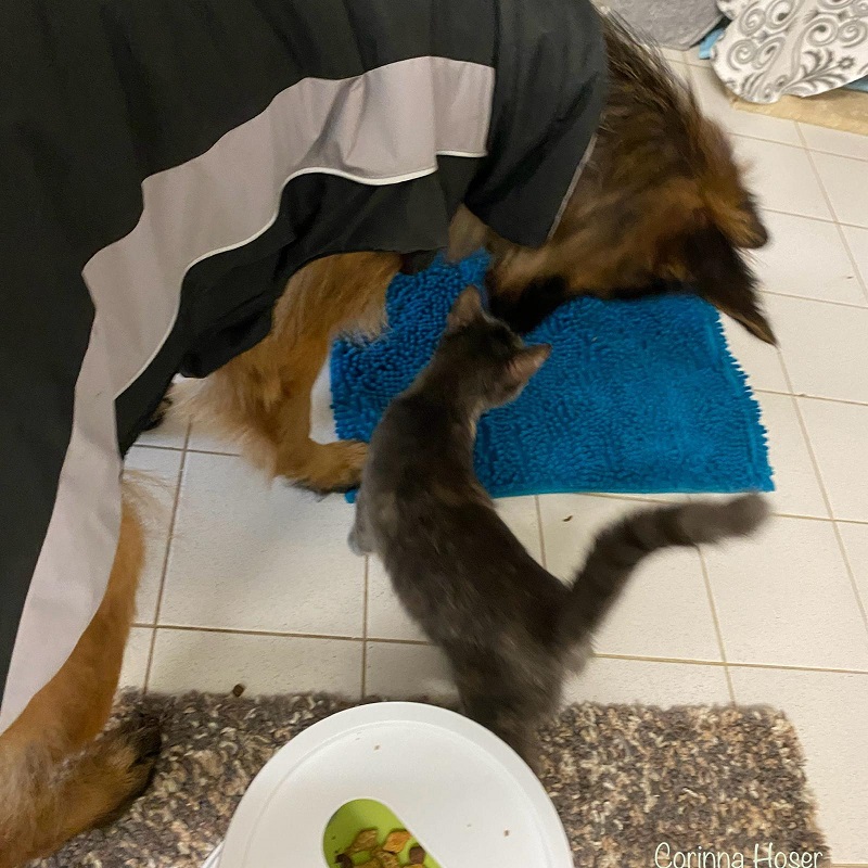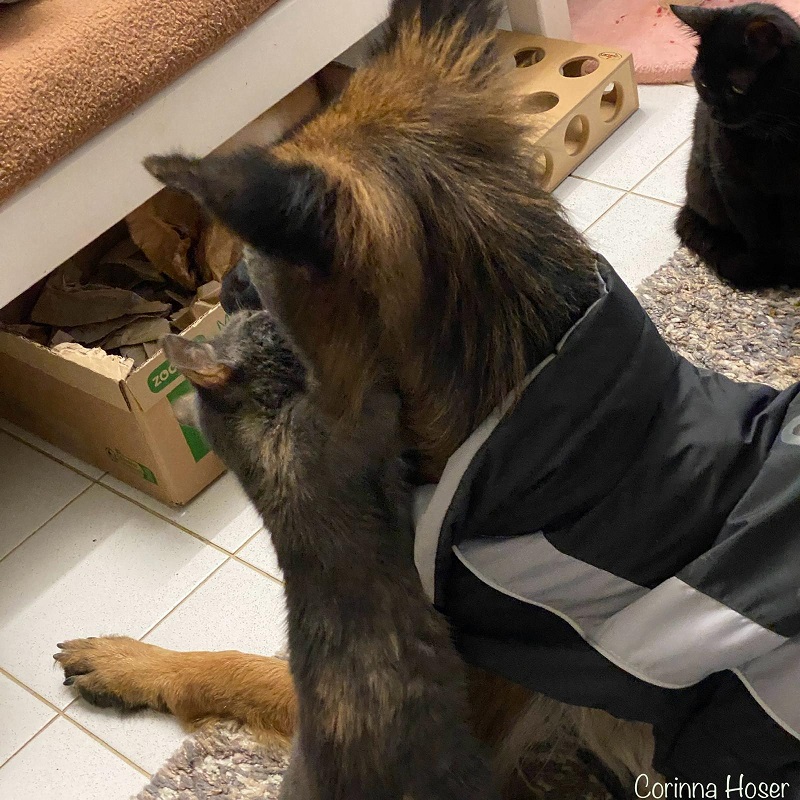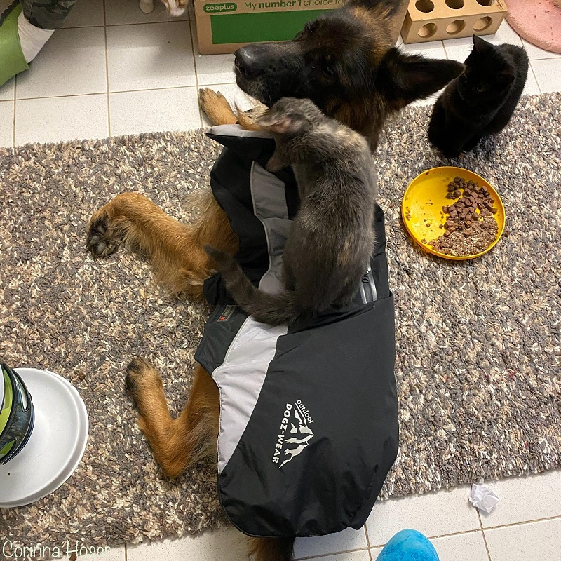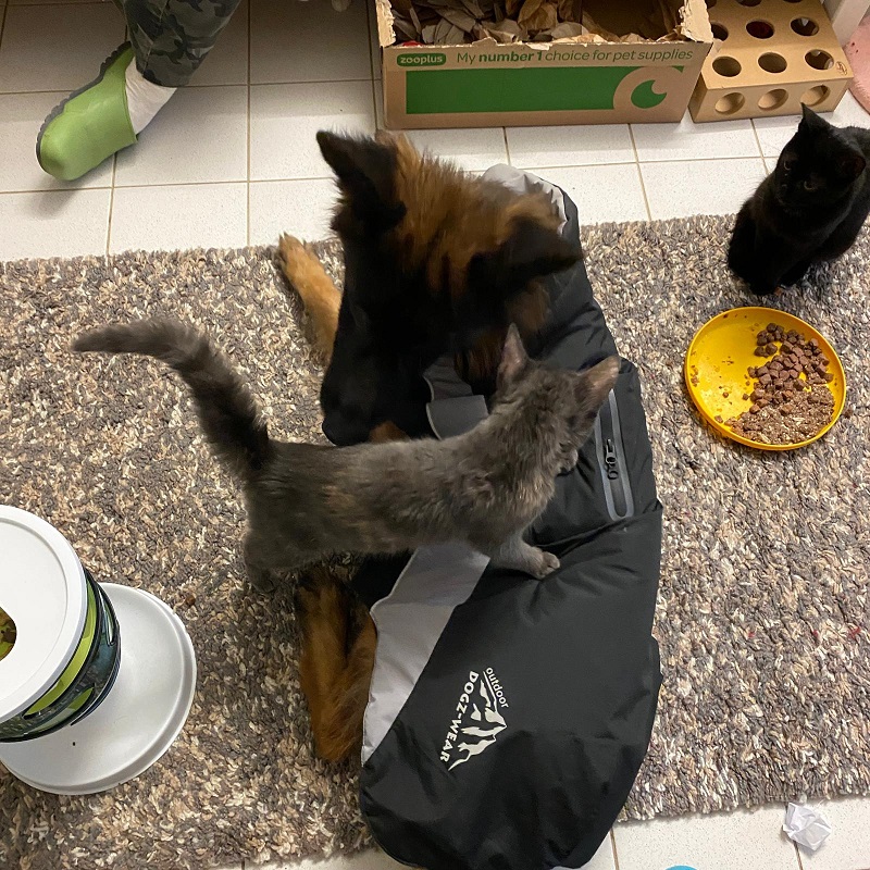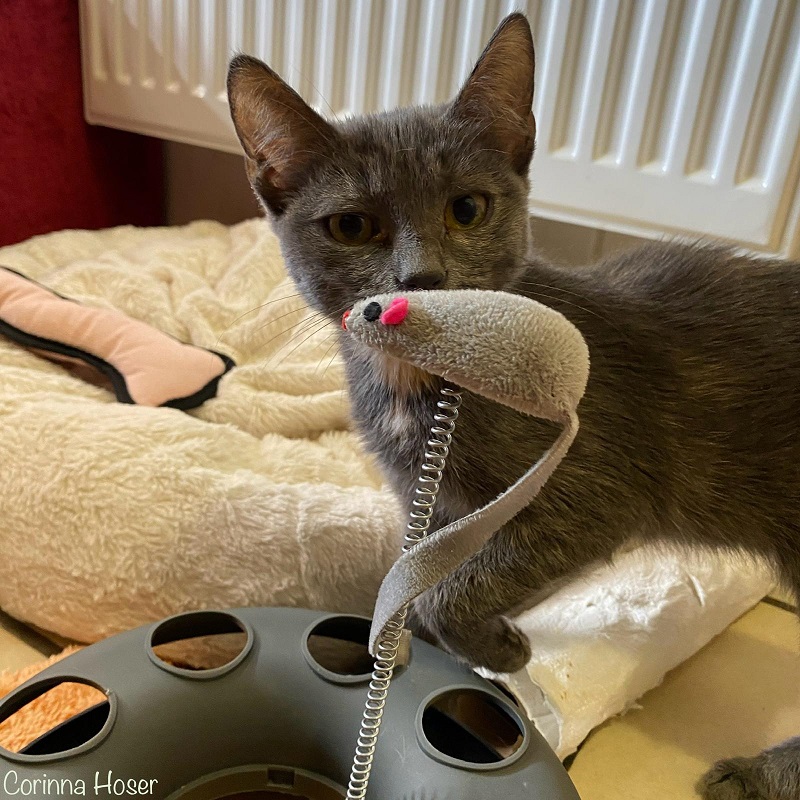 Sie ist eine ganz liebe, verschmuste, junge Katzendame. Sobald der Mensch im Zimmer ist, kommt sie mit Momo angelaufen und sucht sich den Platz auf dem Schoß. Ganz viel streicheln und lieb haben - das ist ihr Motto. Auch sie ist verspielt und kommt mit ihren Artgenossen super klar. Auch hier sucht sie den direkten Schmusekontakt. Artgenossen sind für sie wichtig und so sollte entweder jmd. mit ihr ins neue Zuhause ausziehen oder ein sozialer, verspielter Artgenosse wartet auf sie. Bei einem Hundetest ist sie förmlich (positiv) ausgerastet. Sie ist der Hündin um den Hals gefallen und auf ihr rumgeklettert. Minah fand das super toll!!! Man kann ihr keinen größeren Gefallen machen, als eine katzenverrückte Hündin oder einen Rüden im neuen Zuhause zu haben.