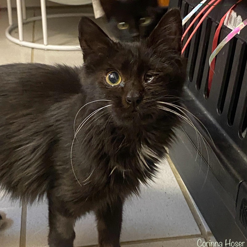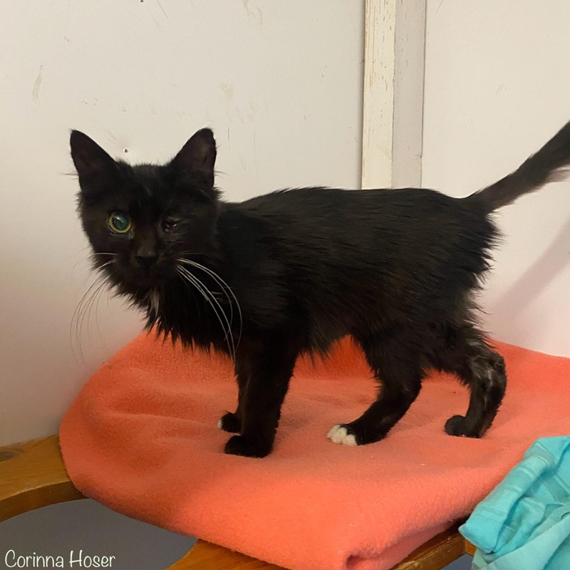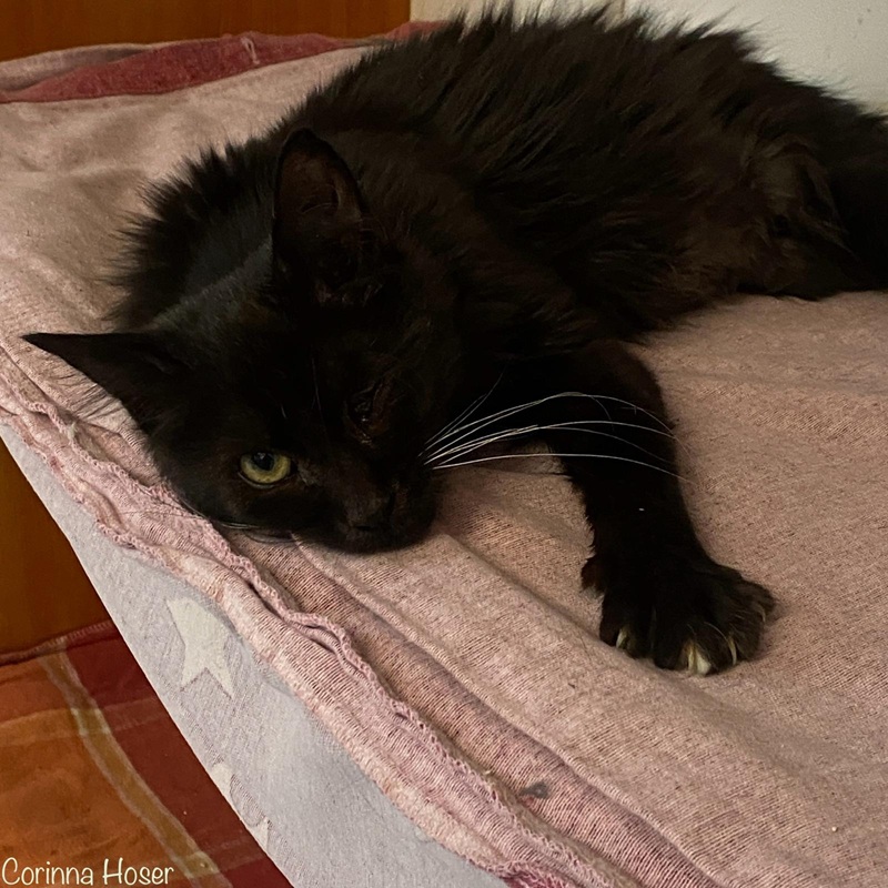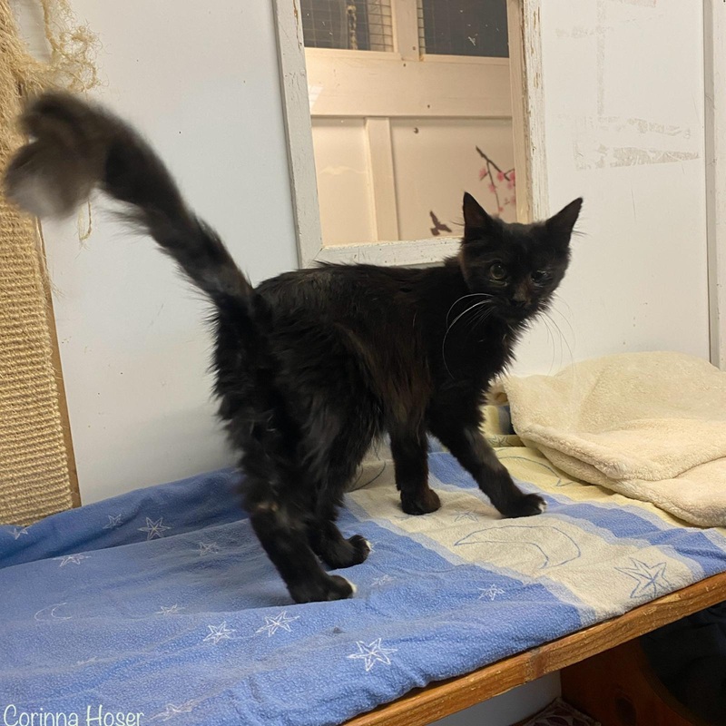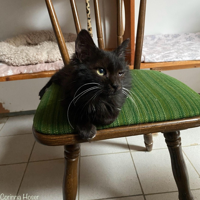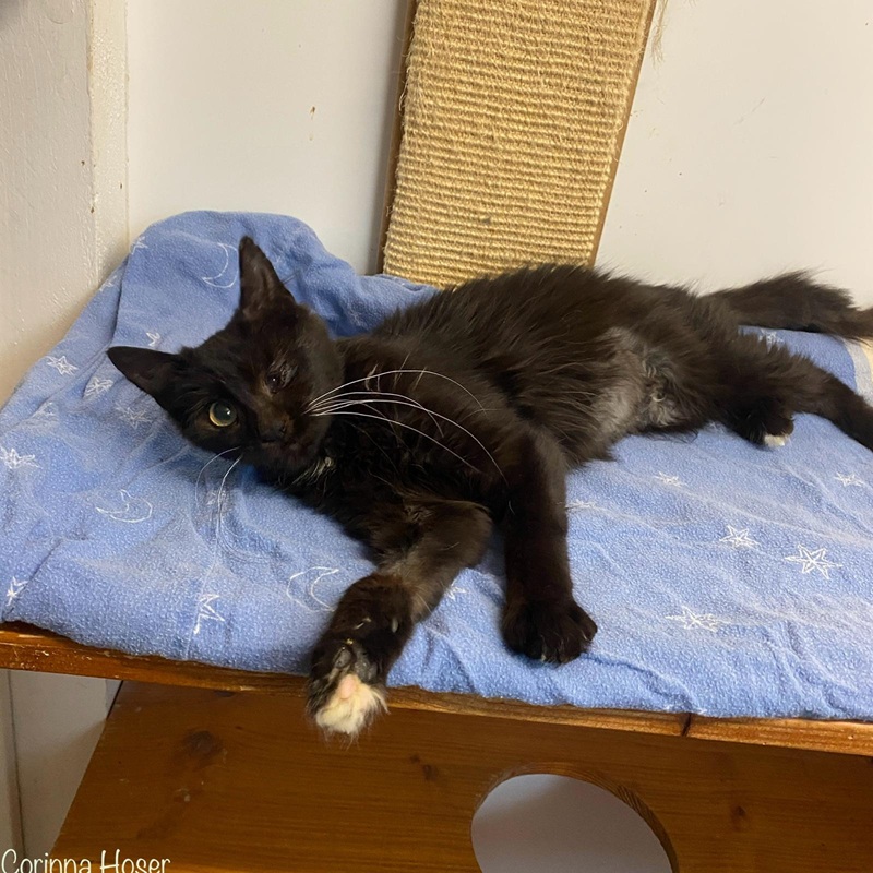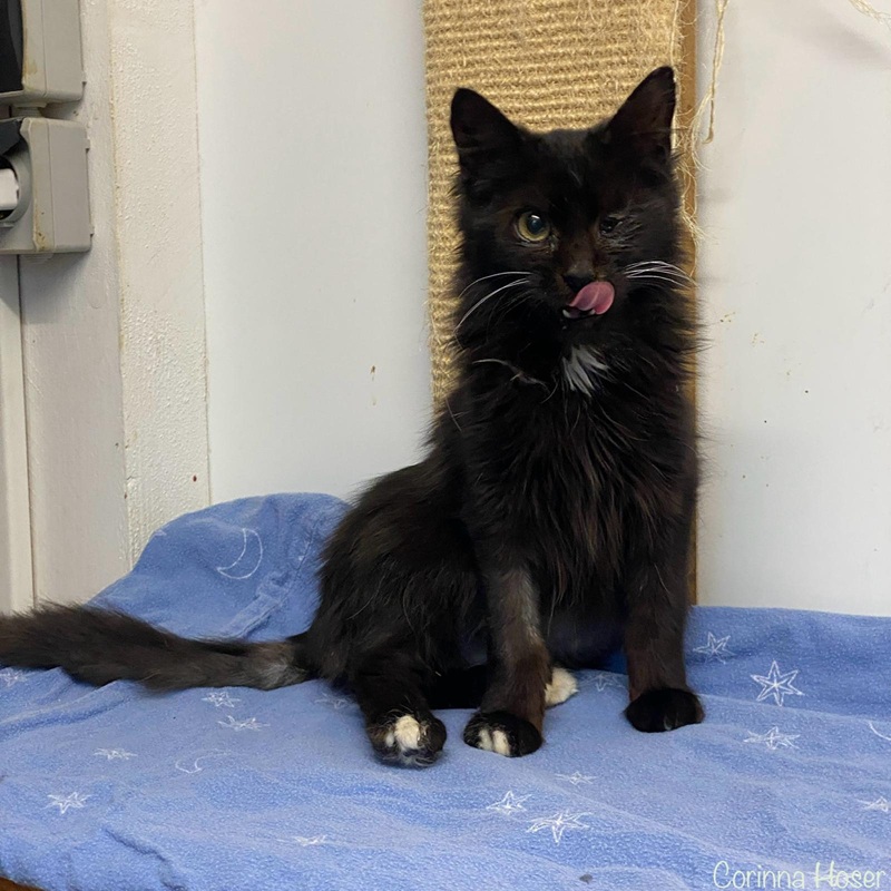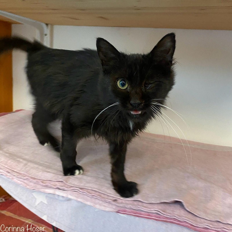 Jeder Mensch wird begrüßt, wenn er in das Zimmer kommt und man muss gut aufpassen, dass sie einem nicht durch die Beine in den Flur entwischt. Das Zimmer kennt sie ja schon - sie will mehr entdecken und erleben. Ihr kleines Defizit mit dem linken Äuglein merkt man ihr überhaupt nicht an. Zottel wurde in der Tieraugenklinik in Stauffenberg vorstellig und nun haben wir auch eine Diagnose. Ihr Lid ist ein Stück weit verwachsen, durch eine frühere Herpesinfektion als Kitten. Eine chirurgische Trennung ist mit den typischen Risikofaktoren möglich. Hier müssen wir noch genau abschätzen, ob wir diesen Schritt mit ihr gehen werden. Das hintere Auge scheint komplett intakt zu sein. Ihr aktueller Zustand bereitet ihr keine Schmerzen.