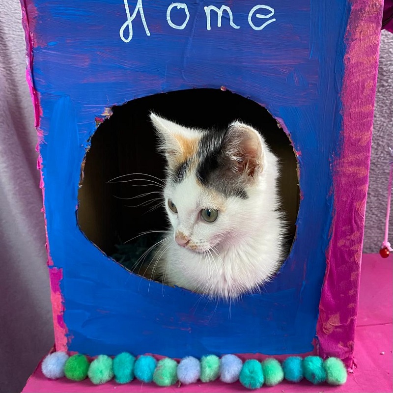 Der kleine Sonnenschein spielt gerne mit der Katzenangel, der Knisterkugel oder auch das Toben im Katzenhaus aus Karton bereitet große Freude.