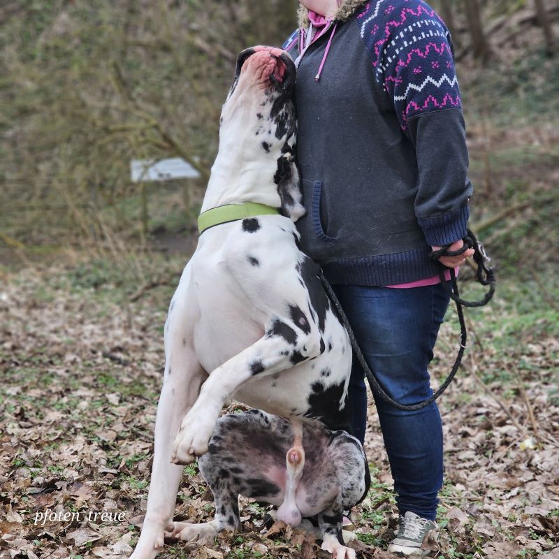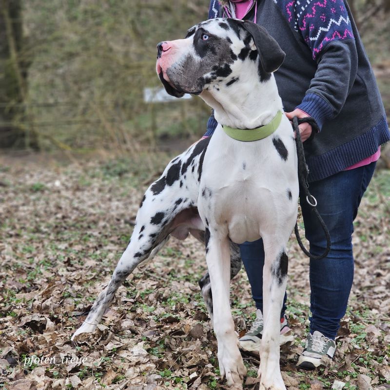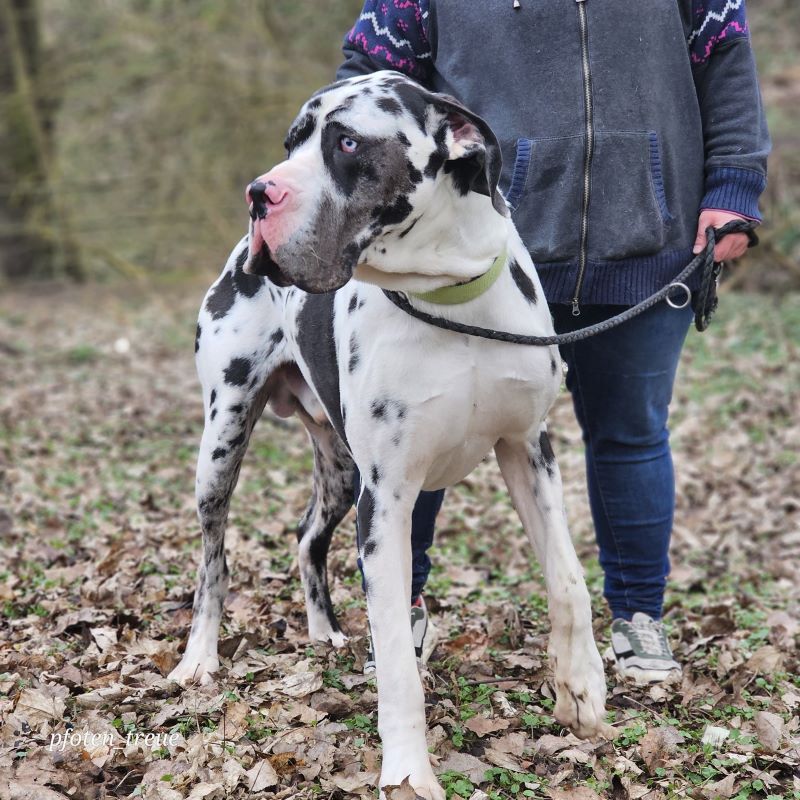 Seine ehemaligen Besitzer beschreiben ihn wie folgt: Ole ist eine Harlekin Dogge und 1,5 Jahre alt. Er ist agil und kennt alle Grundkommandos gut. Er bleibt alleine und fährt auch gerne Auto. Draußen ist er gut händelbar und abrufbar. Ole versteht sich mit anderen Hunden. Nur beim Fressen sollte darauf geachtet werden, dass von anderen Tieren getrennt gefüttert wird, da er sehr verfressen ist. Ole versteht sich ansonten gut mit anderen Hunden und kennt im Außenbereich Katzen und Pferde. Er hat einen blauen Heimtierausweis und ist gechippt. Vor vier Wochen war die letzte Wurmkur. Ole ist nicht kastriert. Ole ist bislang noch etwas stürmisch und eine Hundeschule macht auf jeden Fall Sinn. Der neue Besitzer sollte sich nach Möglichkeit auch mit der Rasse auskennen.