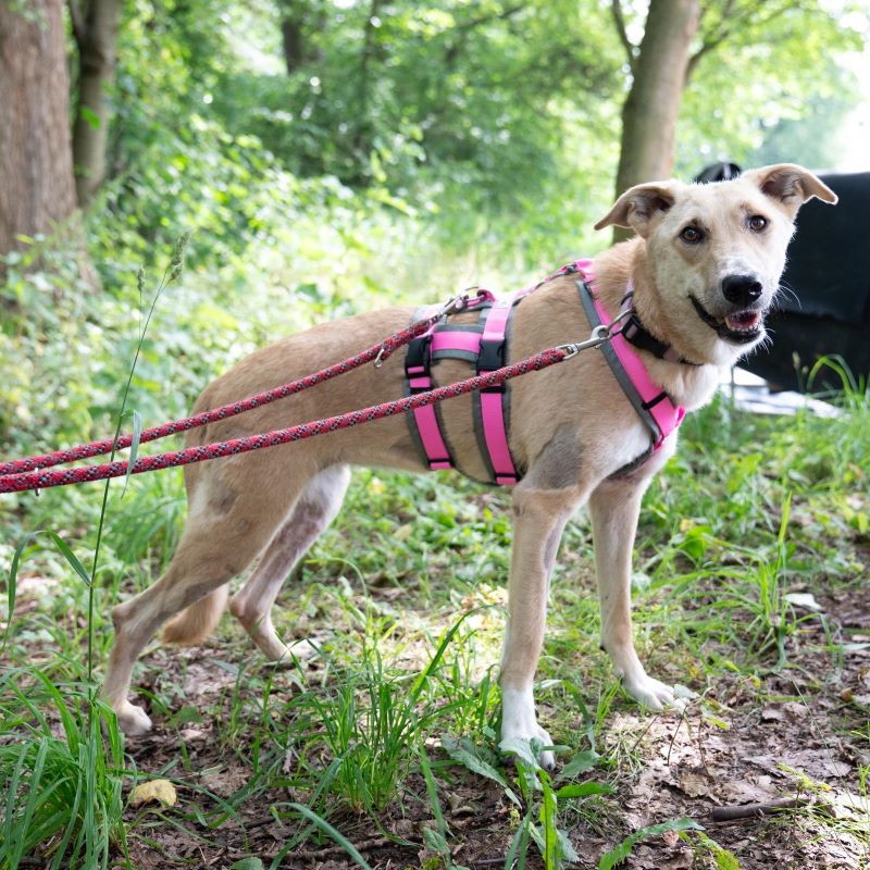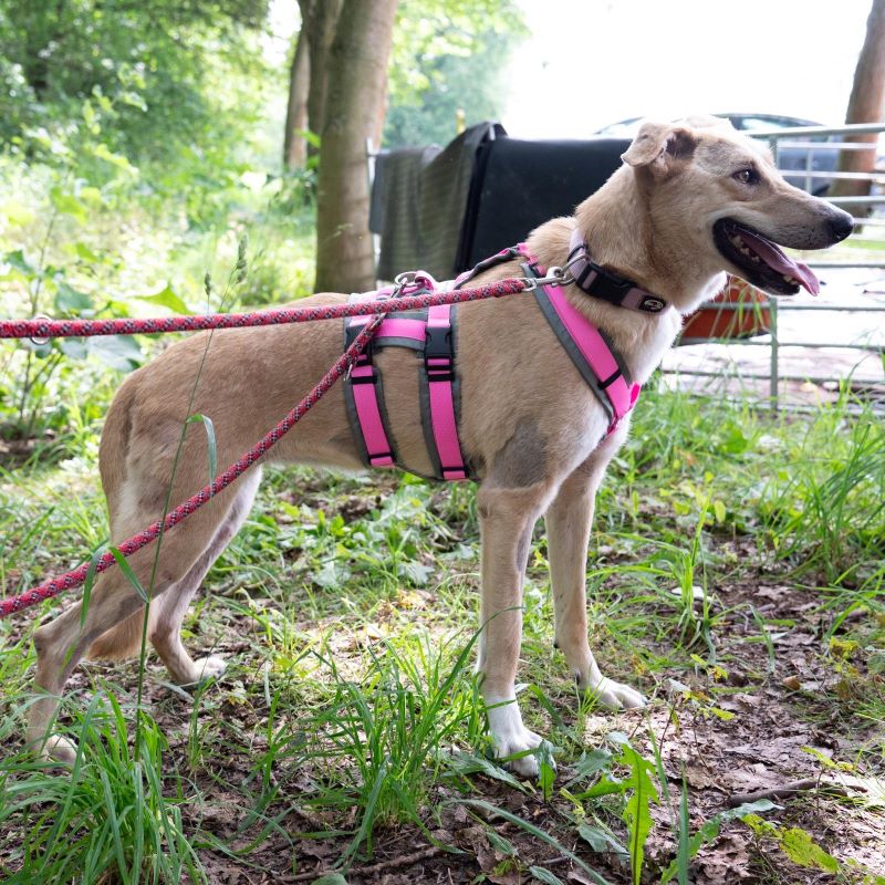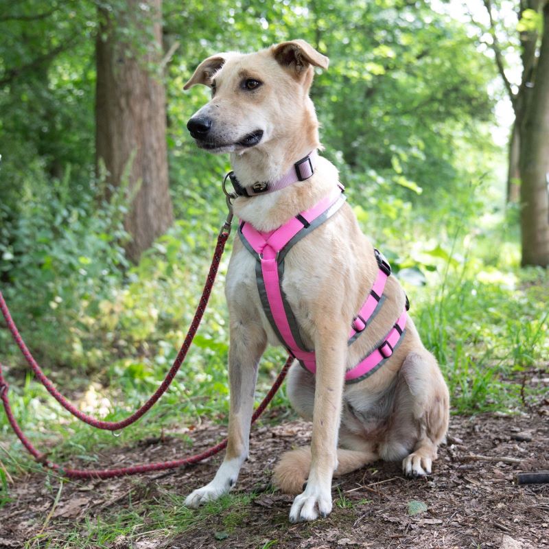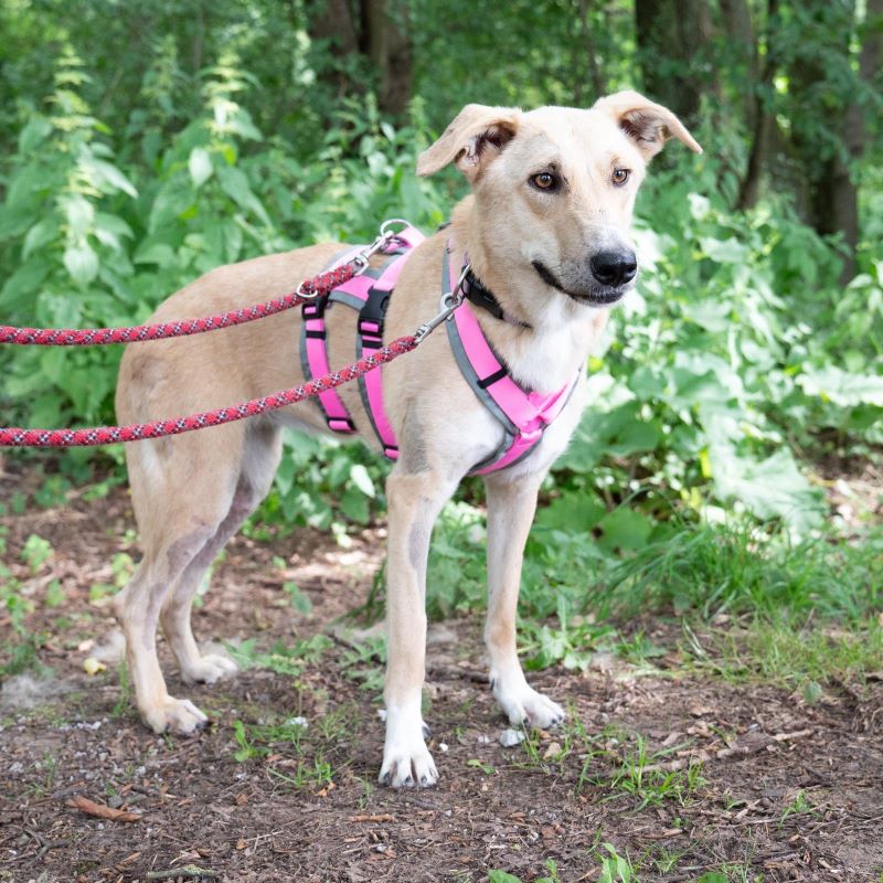 Anfangs war sie etwas ängstlich und konnte den Kontakt zu uns Menschen schlecht zulassen. Durch tägliches Training hat Nairobi verstanden, dass sie keine Angst vor uns Menschen haben muss. Bei fremden Menschen ist sie noch etwas vorsichtig, sucht aber trotzdem den Kontakt und lässt sich auch streicheln, wenn man sich ruhig verhält. Nairobi lebt bei uns in einer gemischten Hundegruppe und ist gut mit Hunden verträglich. Mittlerweile läuft sie auch gut an der Leine, allerdings machen ihr neue Situationen noch Angst. Bei uns besucht sie die interne Hundeschule.