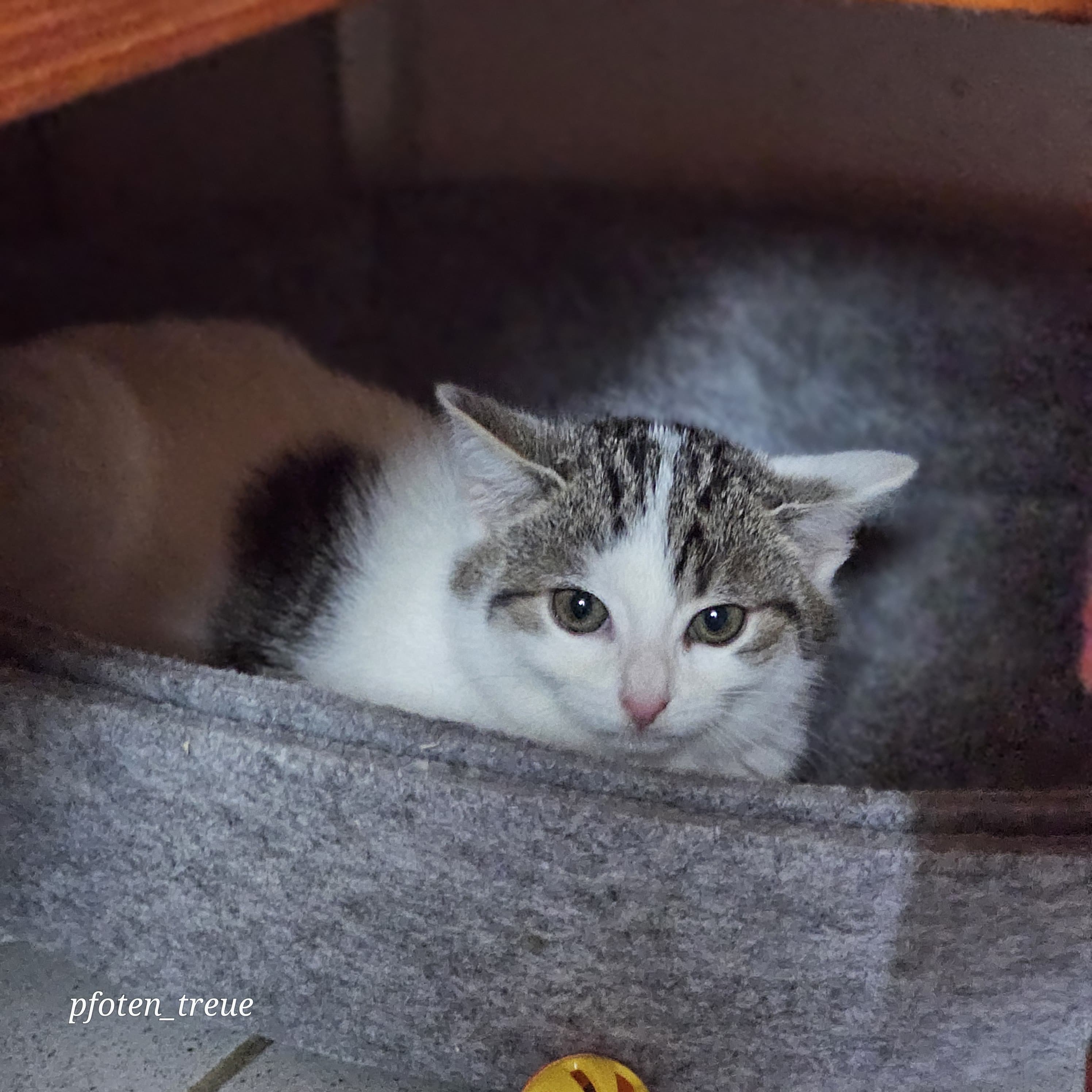 Mittlerweile ist Zulula nicht mehr ganz so scheu, wenn auch immer noch vorsichtig und etwas zurückhaltend. Sie ist ein ruhiges, eher introvertiertes Katzenmädchen, das sich zwar nicht sofort in den Vordergrund drängt, aber durchaus neugierig und verspielt ist. Sie zeigt immer öfter Interesse an ihrer Umgebung und wagt es, sich näher an Menschen heranzutasten. Sie toleriert sanfte Berührungen und ist dabei weniger angespannt als zu Beginn.