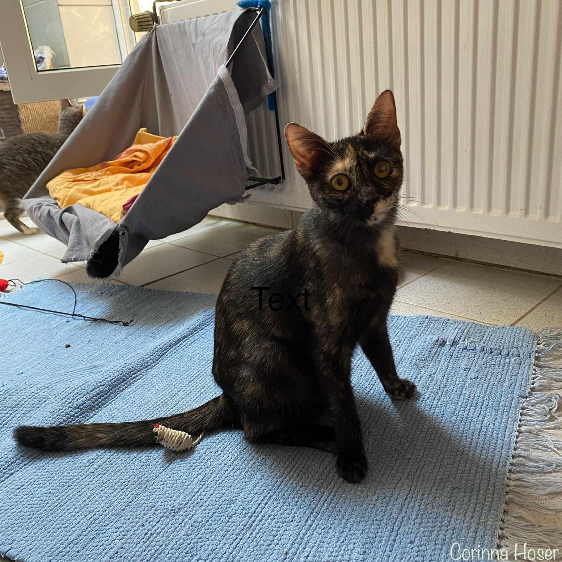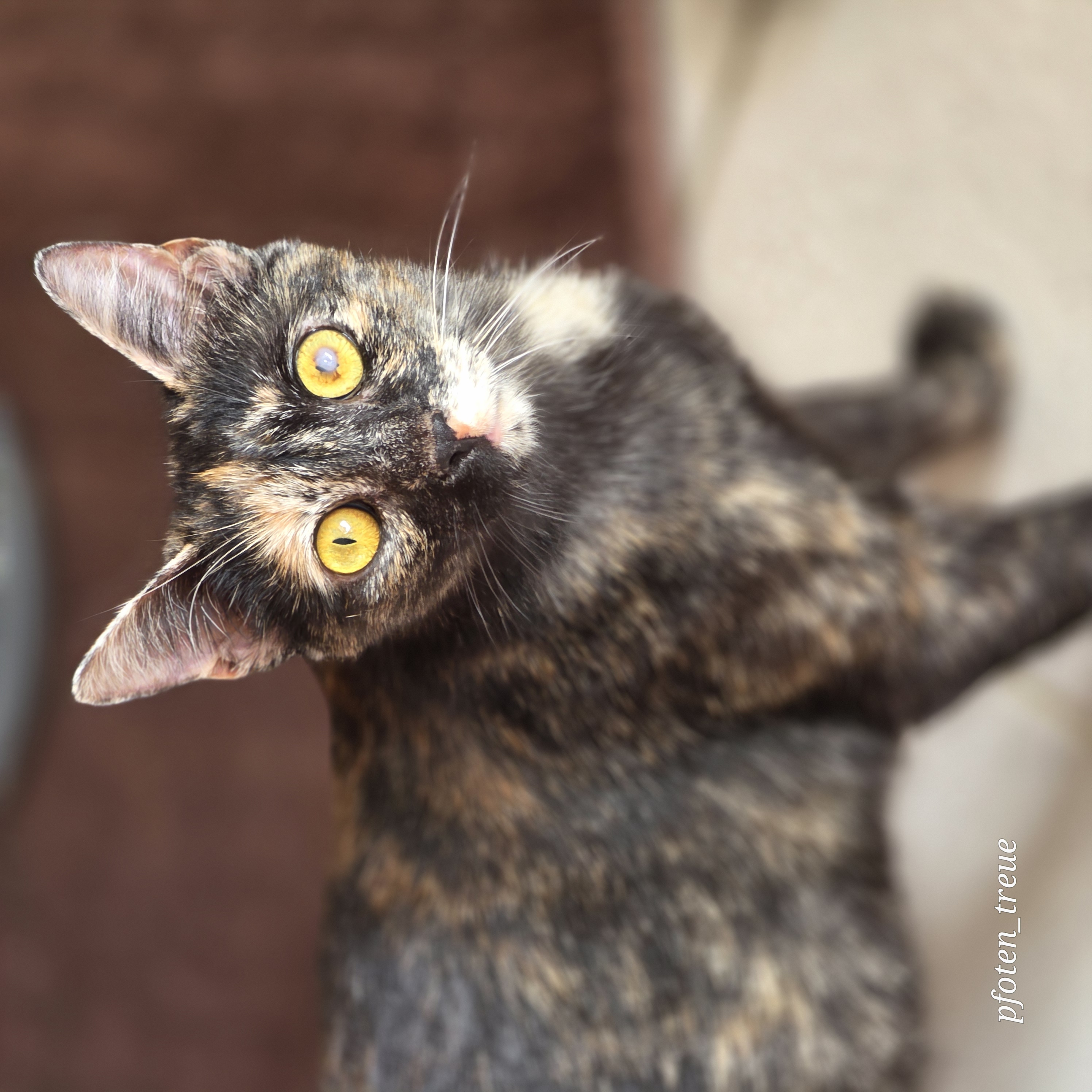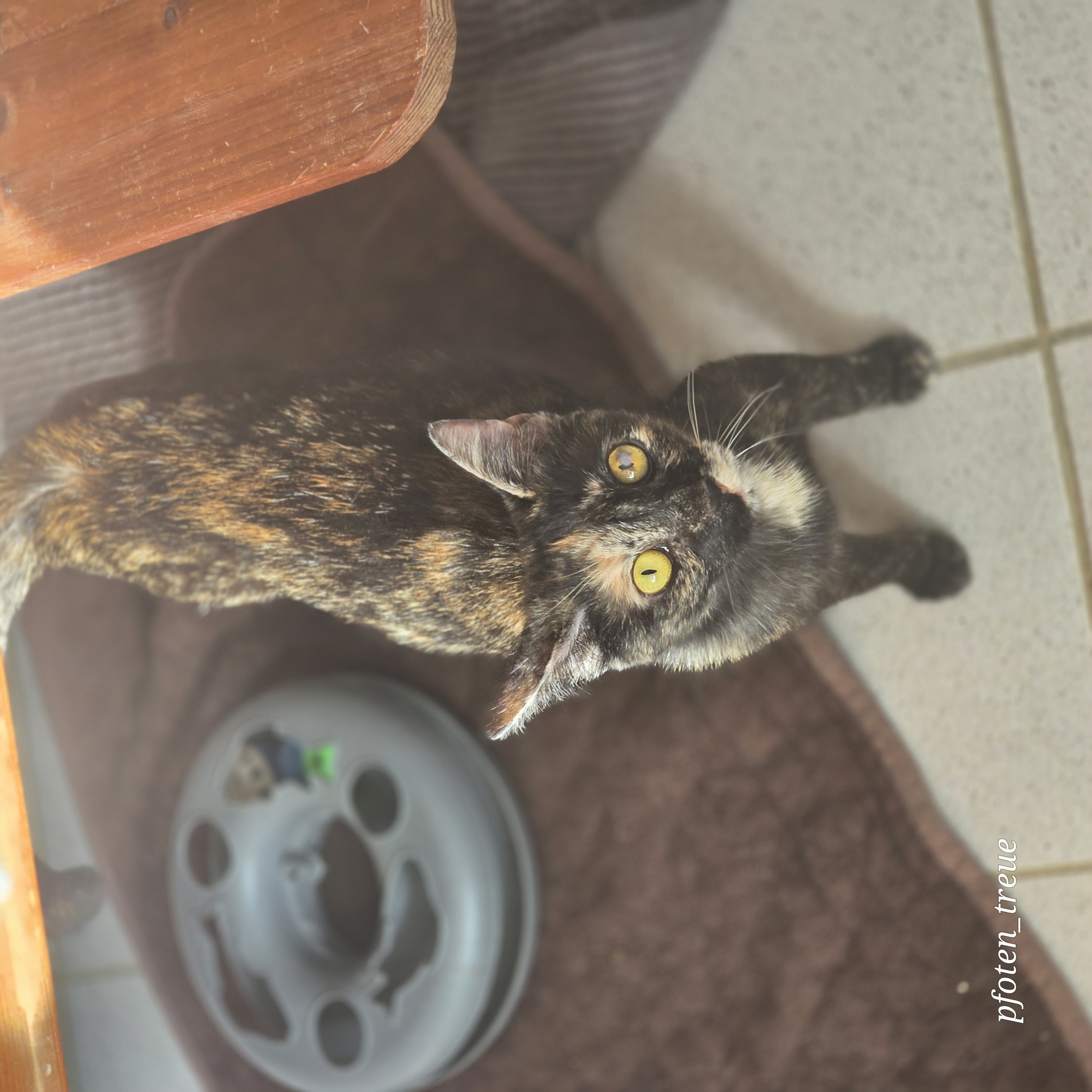 Das wunderschöne Schildpatt-Mädchen ist sehr aktiv und von daher immer bereit für Spielchen. Bei ihr können wir uns ein lebhaftes Zuhause gut vorstellen.
