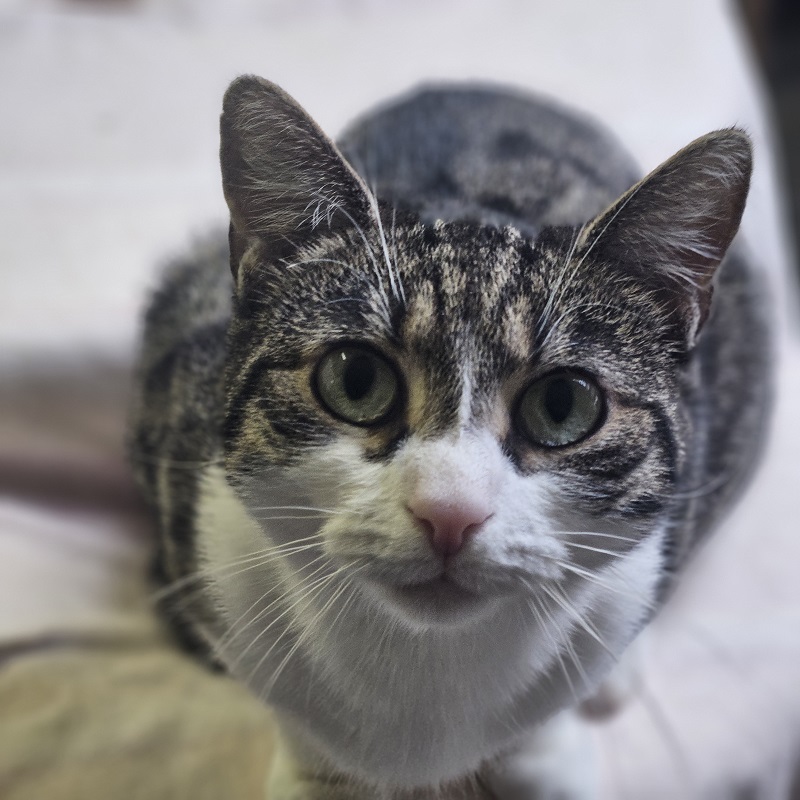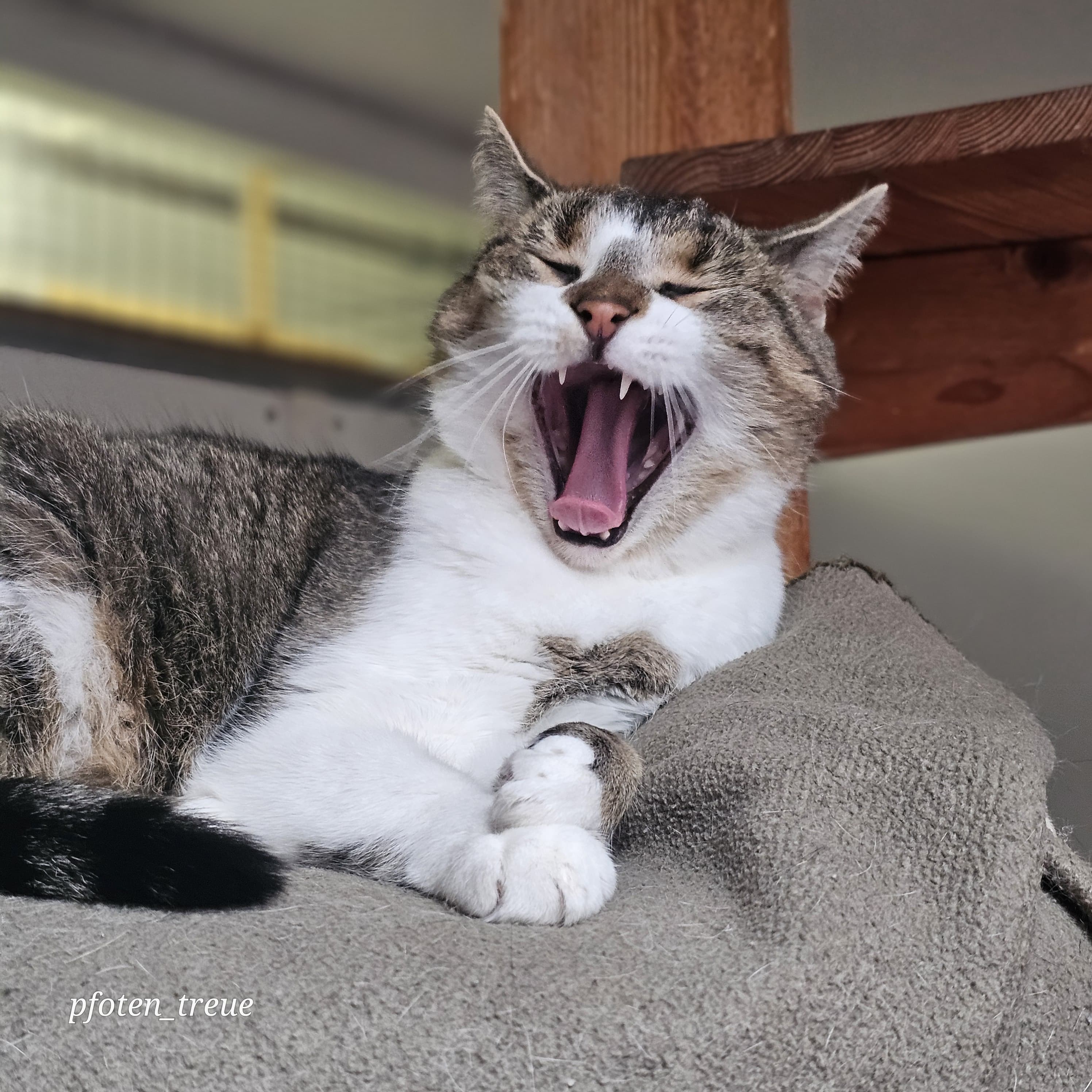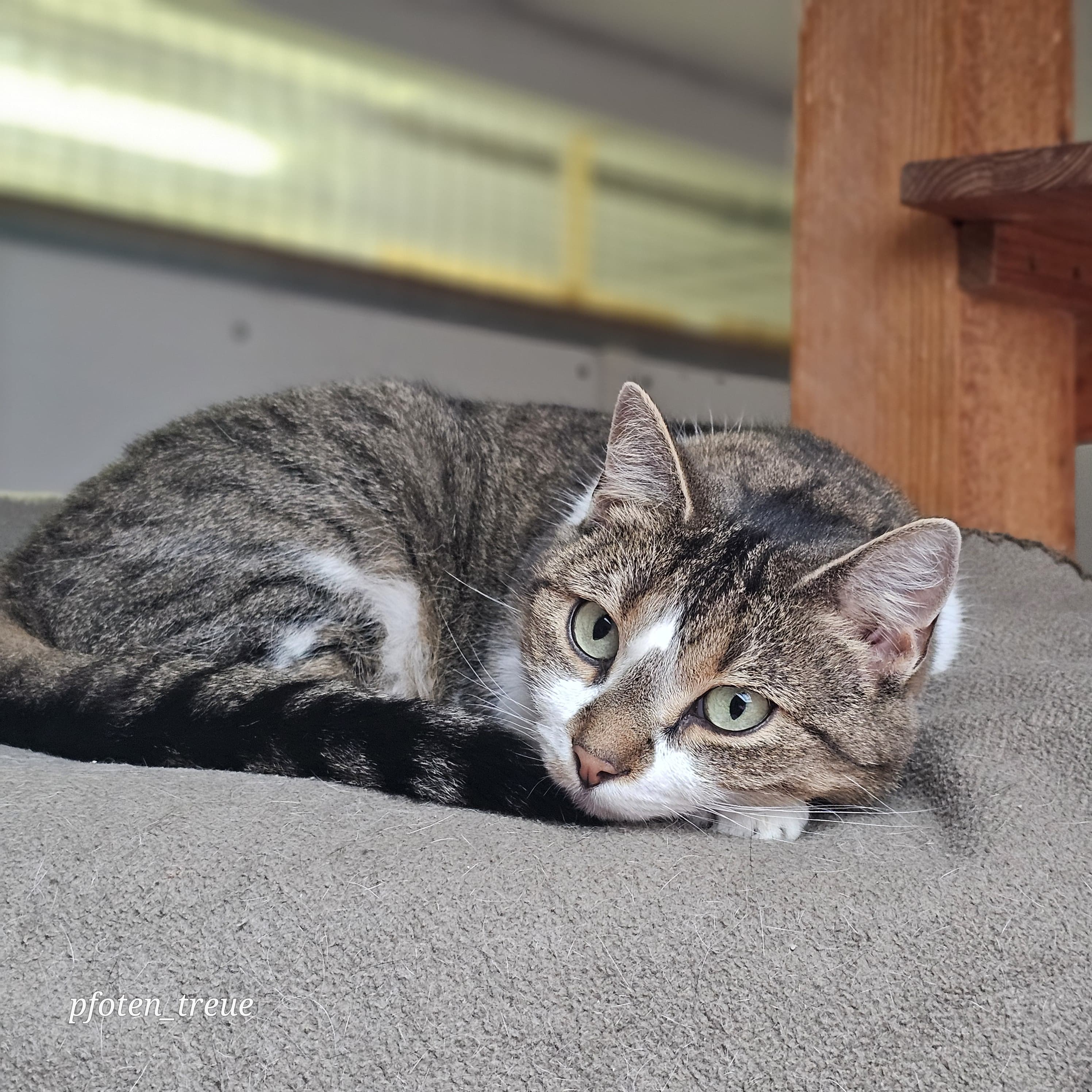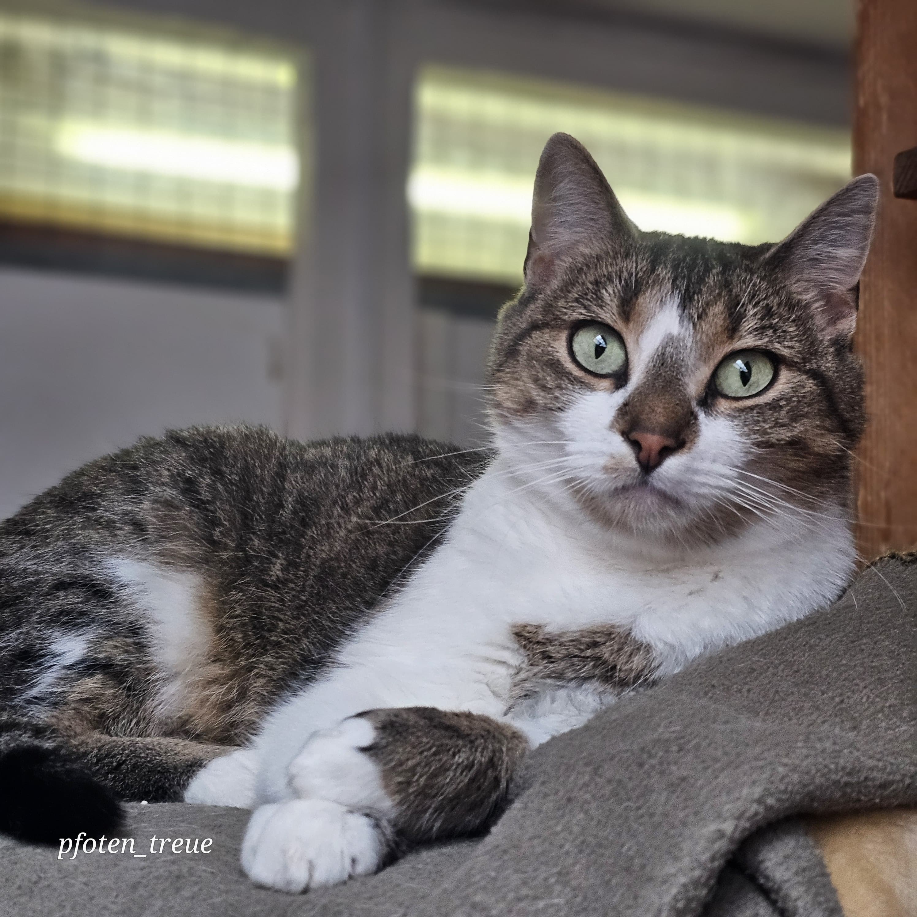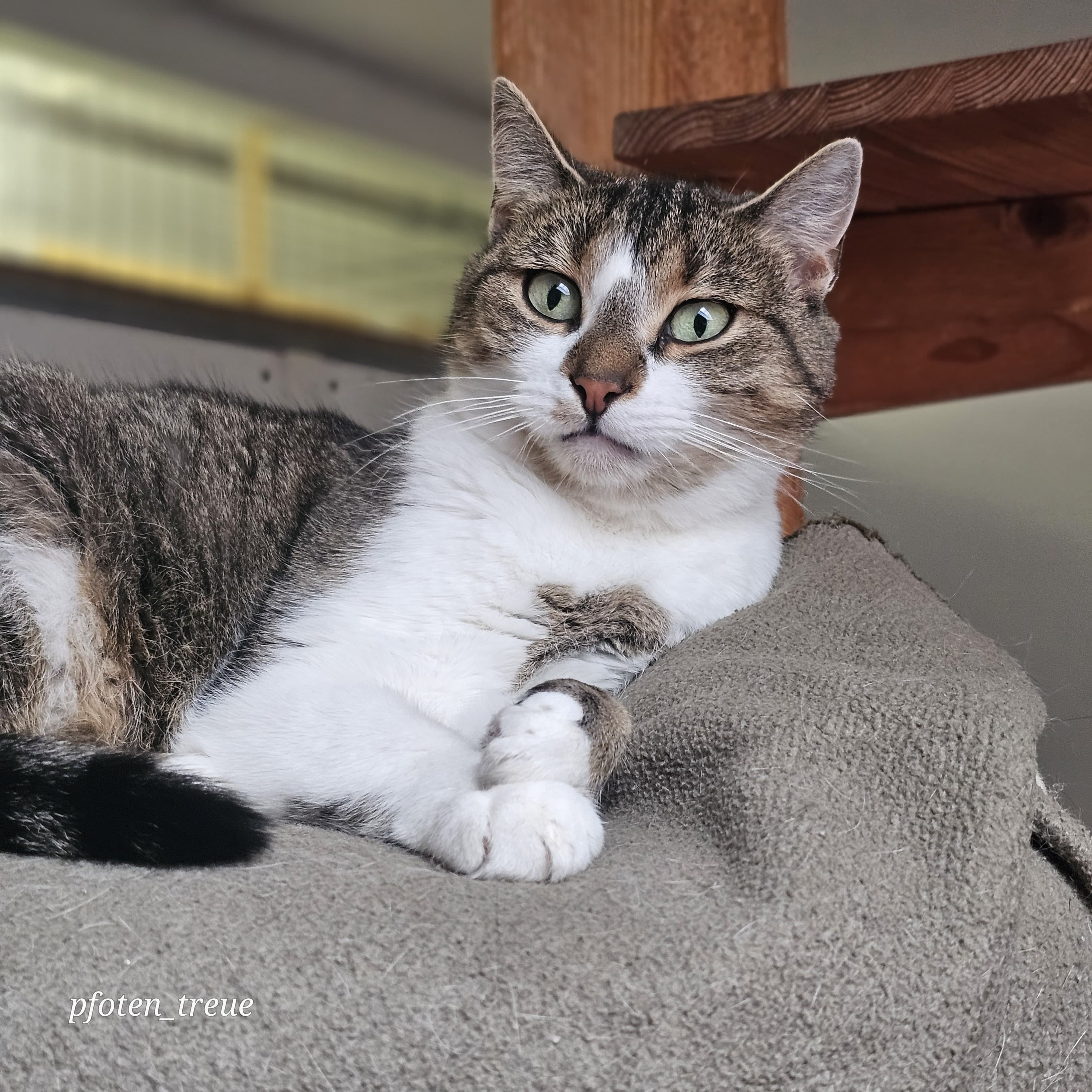 Bounty schaut einen mit ihren grossen, wunderschönen Kulleraugen an. Sie ist in allem absolut unkompliziert und auch ein kleines Plappermäulchen. Wenn ihre Schwester maunzt oder eben ihre Unsicherheit zeigt, ist Bounty direkt zur Stelle und schaut ob bei ihrer Schwester alles gut ist.