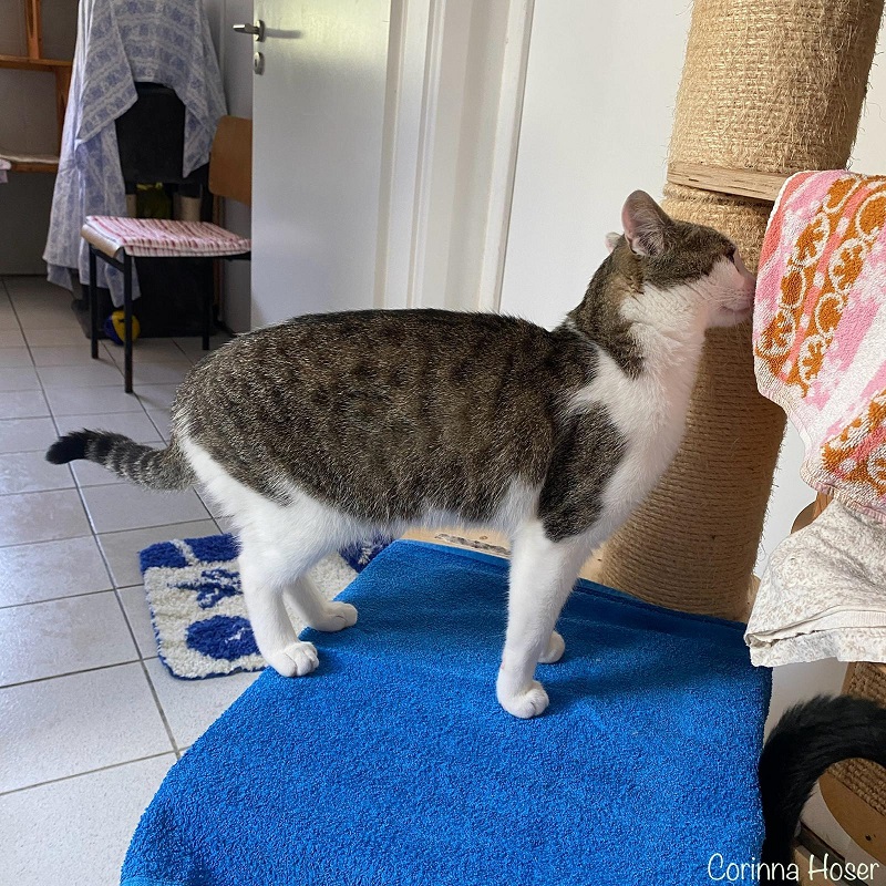 Bei uns zeigte der junge Kerl anfangs erstmal seine skeptische Seite, wen er nicht kannte. Aber mit der Zeit kam die schmusige Seite von ihm raus und dann mag er es sehr gern gestreichelt zu werden. Manchmal, wenn er keine Lust hat auf Schmusen, Spielen und Co., kommt seine Pfote und er zeigt seine Grenzen. Nicht arg, aber er weiß eben was er will. Wenn er die Möglichkeit hat, dann geht er auch einfach, um so seine Ruhe zu bekommen.