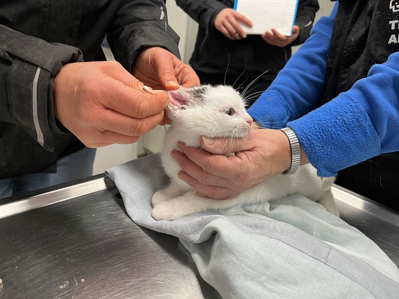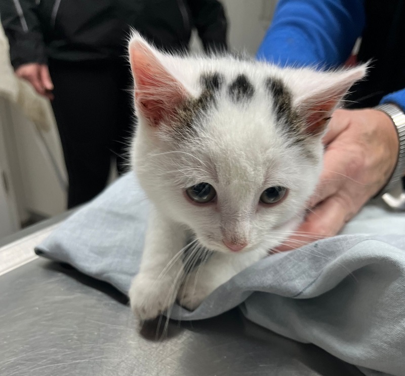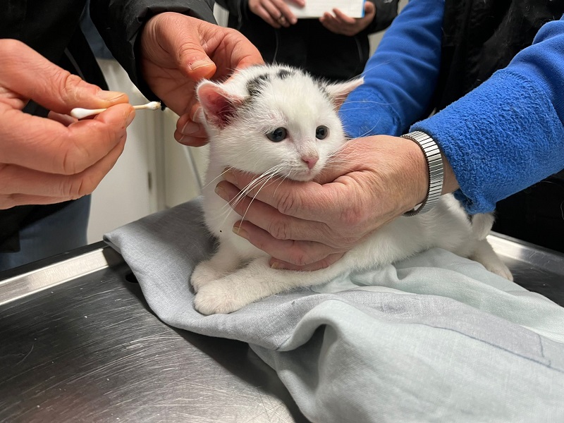 Nach der aufregenden Bergung, konnte er unserer Tierärztin Natascha Hirschmann vorgestellt werden, die ihn direkt untersuchte. Alles ok! Dem kleinen Kerl fehlt nichts gravierendes. So wurde der erste medizinische Check-Up gemacht mit allem drum und dran (Entwurmung, Säuberung der Ohren ...) und weitere werden folgen, wenn dann später z.B. die erste Impfung ansteht.