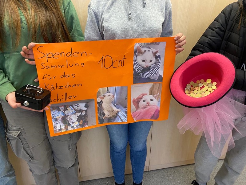 Ganz gerührt sind wir von den spontanen Sammelaktionen der Schüler und Lehrer der Geschwister-Scholl Schule! Kurzerhand sammelten die Schüler eigenständig für den kleinen Schiller, damit die Kosten der tierärztlichen Untersuchung, medizinischen Behandlung und auch die für Futter und Bedarfsartikel gestemmt werden können. So kamen durch die Schüler und Lehrer eine fantastische Summe von 157,81€ zusammen. Ein riesen Dankeschön an alle Beteiligten. Da waren Spenden dabei, von denen man so gerühert war, weil das heimische Sparschweinchen geknackt und extra 5€ für das kleine Katerchen davon genommen wurden. Einfach nur großartig! Durch diese tolle Spendenbereitschaft muss der kleine Schiller nicht nach Gelnhausen und kann auf seiner Pflegestelle bleiben, von der aus er ein neues, liebevolles Zuhause mit Anschluss an gleichaltrige Artgenossen sucht.