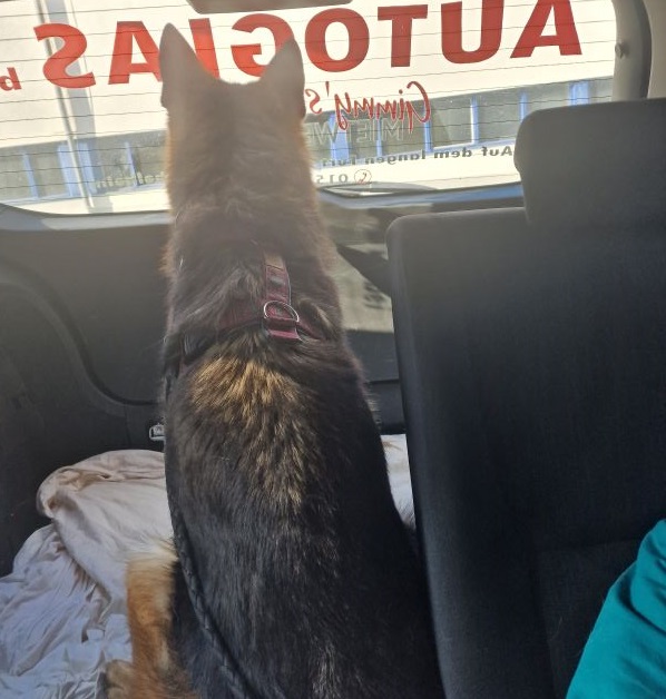Also zuerst die Autofahrt: Daike ließ sich problemlos von zwei Personen ins Auto heben. Während der Autofahrt schien sie sehr interessiert und schaute aus dem Fenster. Zwischenzeitlich fühlte sie sich dennoch nicht so ganz wohl und fing auch an zu zittern, aber mit vielen Streicheleinheiten konnte man sie etwas beruhigen. Sie war noch sehr unsicher und wusste nicht, ob sie lieber sitzen oder liegen soll. Generell verlief die Autofahrt sehr gut und sie hat es super gemeistert. Ich denke, wenn sie öfter mit im Auto fährt wird sie sich schnell daran gewöhnen. Sie war sehr lieb. Auch das Herausheben aus dem Auto mit zwei Personen klappte super.