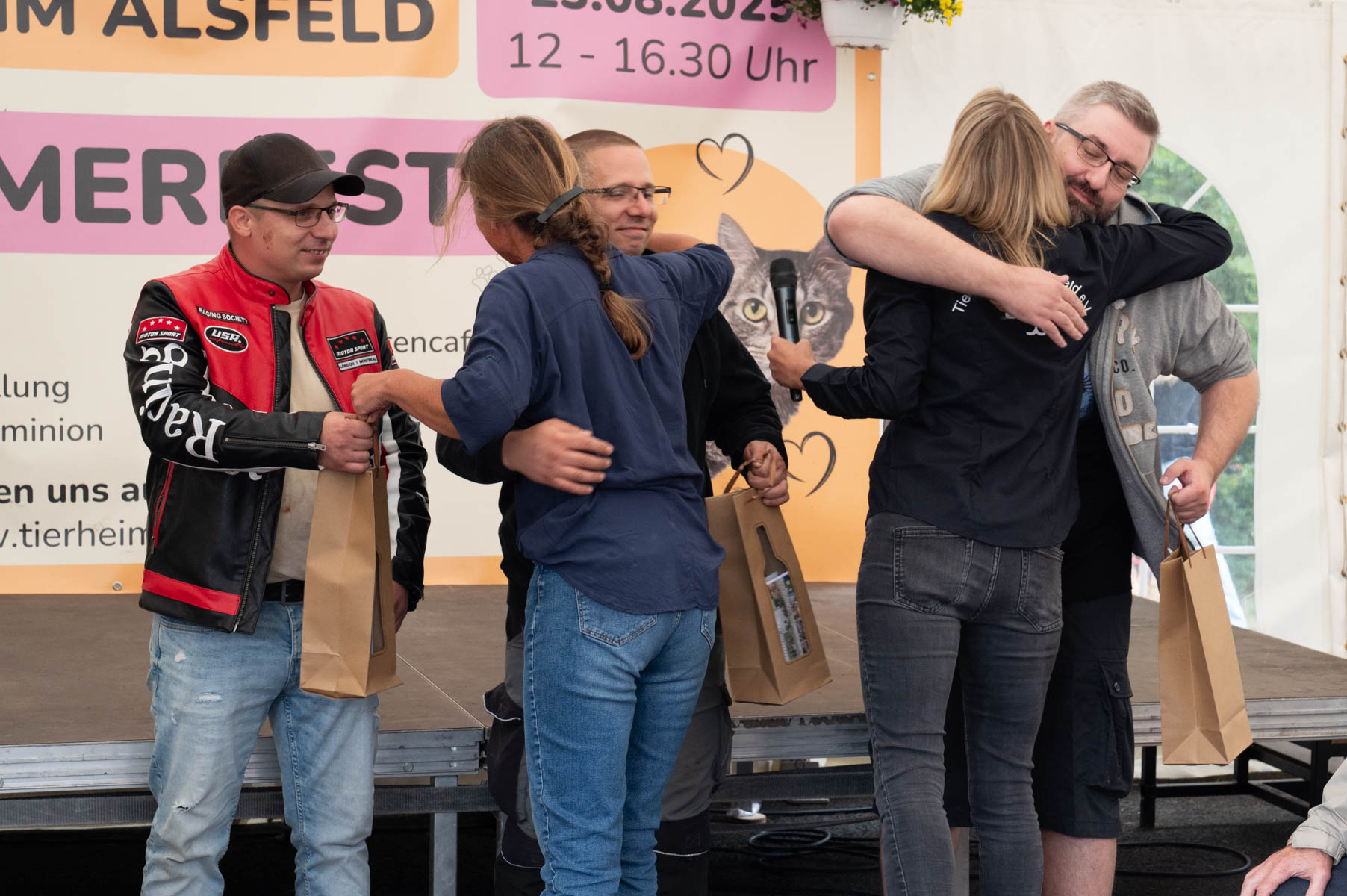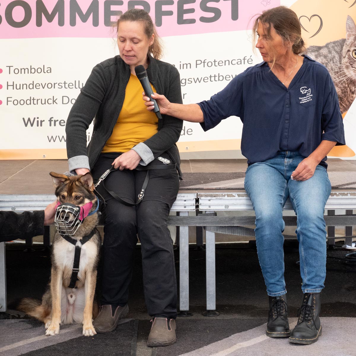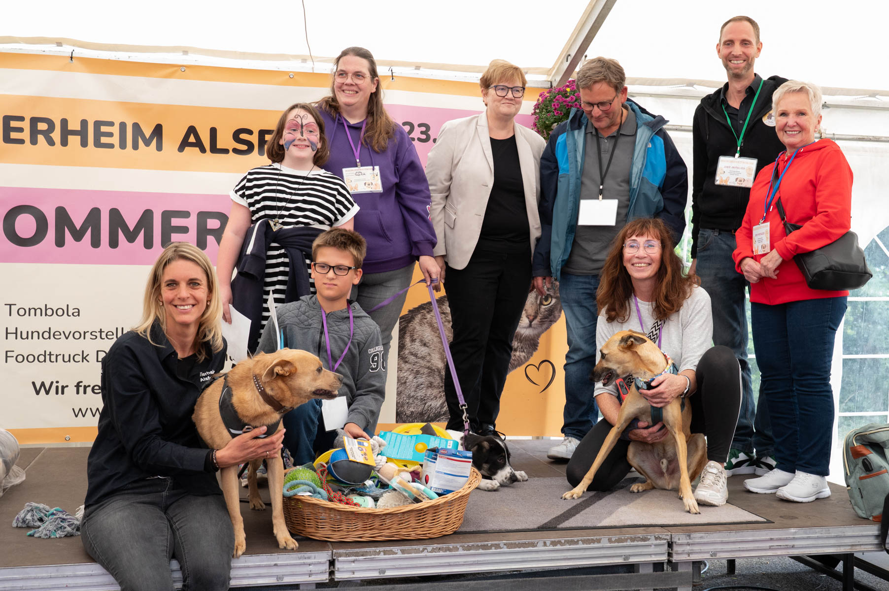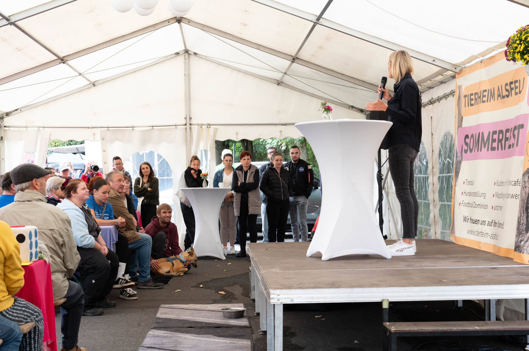 Los ging es mit der Eröffnungsrede der 1. Vorsitzenden Ann-Catrin Schmidt, die über die „Wunder“ in unserem Tierheim sprach. Von Tieren, die trotz Handicap ein traumhaftes Zuhause gefunden hatten und von dem Hoffen und Bangen im Tierschutz und das es ohne die Mitarbeiter nicht zu stemmen wäre. Diesen wurde dann in einem extra Punkt auf der Bühne gedankt sowie einzelnen Helfern, die mit besonderem Einsatz glänzten. Ein ganz großes Dankeschön ging an die Vorstandsbeisitzerin Gerlinde Grebe. Sie hat das Sommerfest wieder mit einem Team geplant und für alles gesorgt (Anträge und Genehmigungen einholen etc.), damit dieses reibungslos stattfinden konnte. Absolut klasse! Ohne die eifrige Hilfe für all die Vorbereitung, Planung, Auf-/ Abbau, Dekoration und allem, was dazu gehört, wäre so ein Fest nicht ohne diese großartige Hilfe möglich gewesen. Danke an alle Helfer!