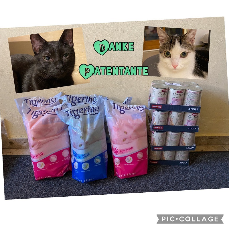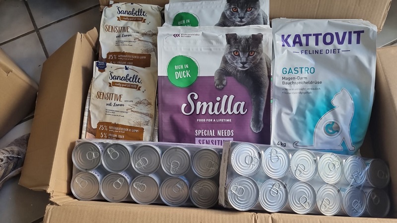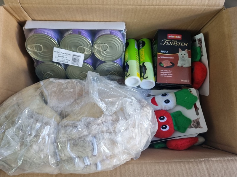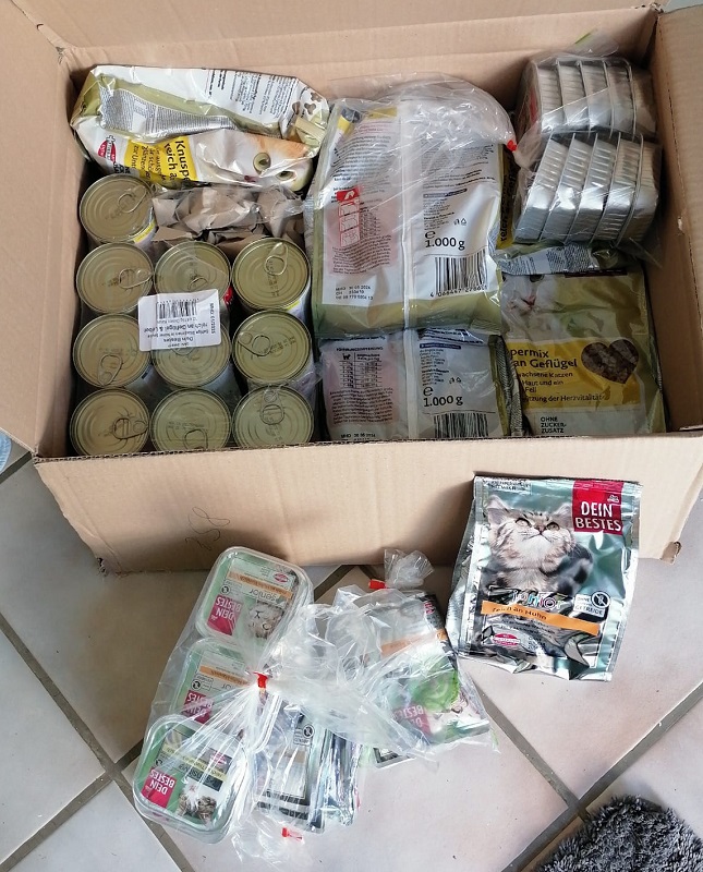 Carola Hohl schickte ein Paket mit Futter, Kuschelbett, Leckerlies und Stinkekissen auf den Weg. Wir bedanken uns im Namen unserer Fellnasen! Ganz toll.