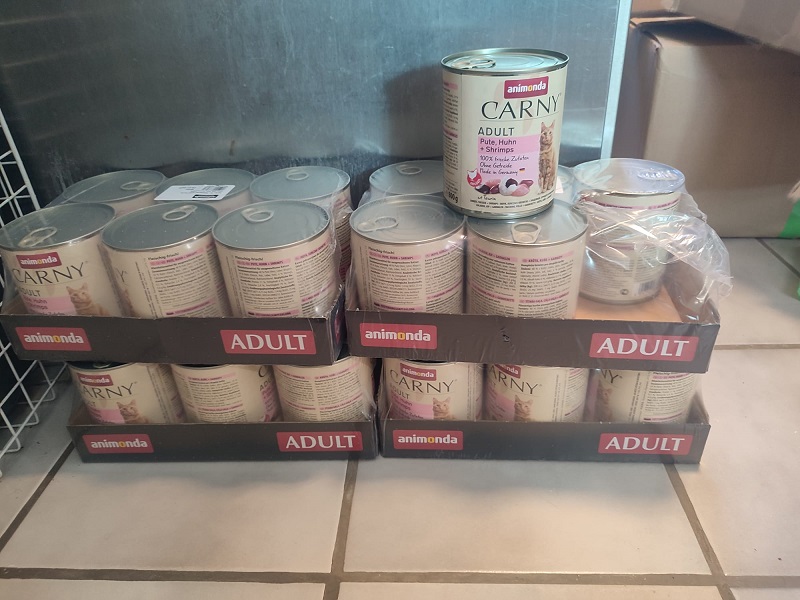 Diverses Katzenfutter spendete uns Manuela Knieling-Nuhn. Dafür sagen wir herzlich "Dankeschön"! AUch hier haben unsere Fellnasen eine bunte Auswahl.