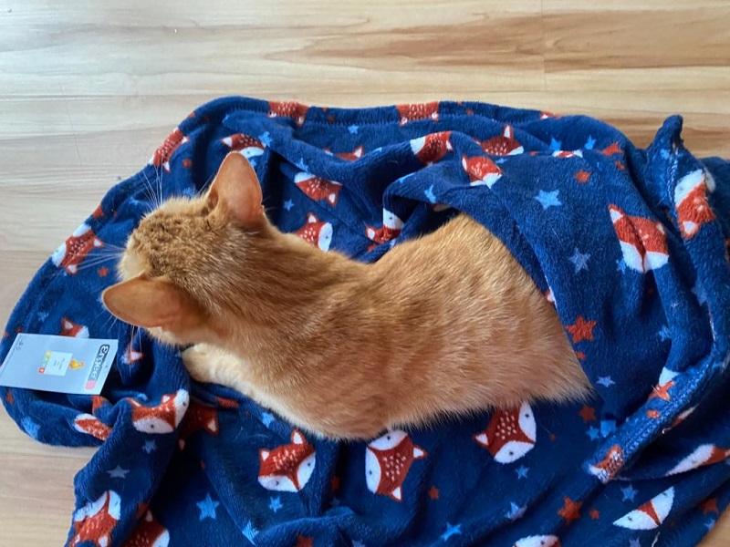Das nächste große Dankeschön geht an Susanne Mikschy. Sie hat sehr hilfreiche Sachen an unser Tierheim und den Flohmarkt gespendet und an Kater Knöpfchen. Knöpfchen findet seine neue Fuchsdecke klasse. Sie ist total passend, da Knöpfchen auch schon einmal mit einem Fuchs von den Nachbarn verwechselt wurde. Und die Sternchen-Decke ist super für das Schlafen in der Nacht! Vielen, vielen Dank!