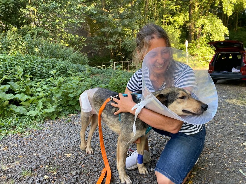Hündin Biene kam erst vor ein paar Tagen zu uns ins Tierheim. Wir haben sie von unserem Partnerverein Tierhilfe Hoffnung übernommen, da ihr in Rumänien die Amputation des rechten Beins drohte. Wieso, weshalb Biene diese Verletzung hat, ist uns nicht bekannt. Wahrscheinlich, wie bei so vielen Verletzungen der dort frei lebenden Hunde auf den Straßen Rumäniens, ist es meist auf einen Autounfall zurückzuführen. Wir wollten Biene ihre Chance geben und sie unseren Ärzten in der Klinik Hofheim vorstellen um hoffentlich ihr Bein zu retten.