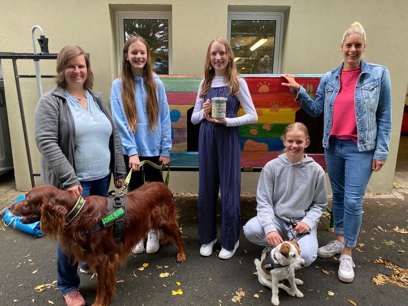 Eine überraschende Spendensumme kam beim Schulfest der Albert-Schweitzer-Schule zusammen. Vorausgegangen waren 2 Projekttage in denen Schülerinnen und Schüler zusammen mit ihrer Lehrerin Frau Sabrina Bickert (li.) Hundehütten von unserem Tierheim für unsere Hunde bemalten und Hundekekse backten. 20 Tüten waren es am Ende, die sie auf dem Schulfest gegen Spende verkauften!