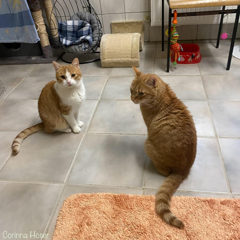 Für Vegeta war die anfängliche Situation sehr belastend. Aber so langsam taut er immer mehr auf und traut sich zu den Menschen. Er ist so ein lieber Kerl! Man kann ihn leicht kraulen und auch streicheln, aber man merkt ihm einfach die Unsicherheit / Angst noch an. Sobald das Tierheim schließt und er mit seinen Artgenossen unter sich ist, dann taut er auf. Er ist neugierig, schaut sich alles an und spielt auch mit. Er wird nur mit seinem Bruder Zeus ins neue Zuhause ziehen. Er kann schon wild spielen und auch mal ärgern, was Zeus gut abfangen kann. Bei ihm bekannten Menschen taut er langsam auf und kullert sich auf dem Boden rum. Zeus hingegen war bereits vermittelt, jedoch kam der vorhandene Kater leider überhaupt nicht mit ihm und seiner sehr verschmusten und einnehmenden Art zurecht, weshalb Zeus wieder zu uns zurück musste. Bei uns angekommen hat sich Vegeta so sehr über ihn gefreut, dass wir die Beiden auch nicht mehr trennen möchten und werden. Zeus ist ein toller, verschmuster Typ. Er kommt wirklich super mit seinen Artgenossen klar und zeigt sich verspielt und neugierig. Er mag Hunde sehr gern und hat überhaupt kein Problem mit diesen. Auch er braucht nat. seine Zeit um Vertrauen aufzubauen. Bei ihm bekannten Menschen kommt er direkt an und lässt sich sehr gern streicheln.
