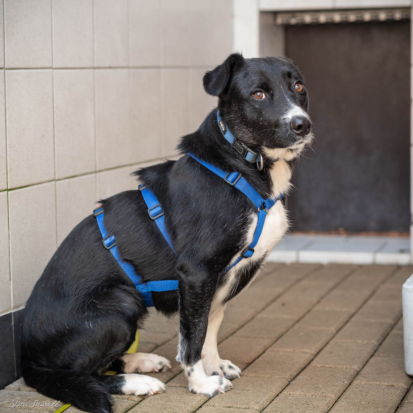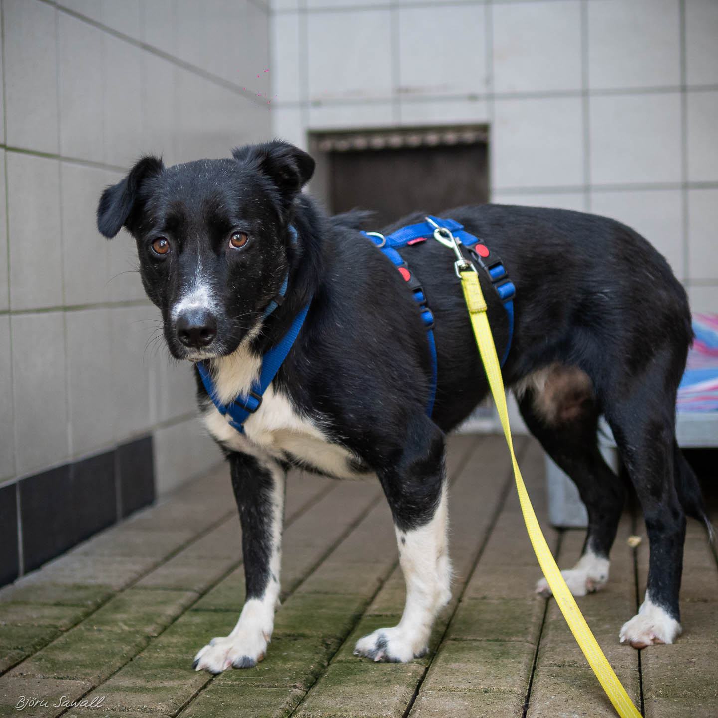 Sie geht gerne spazieren und läuft gut an der Leine. Hier ist sie natürlich noch vorsichtig, orientiert sich aber gut an ihrem Menschen.