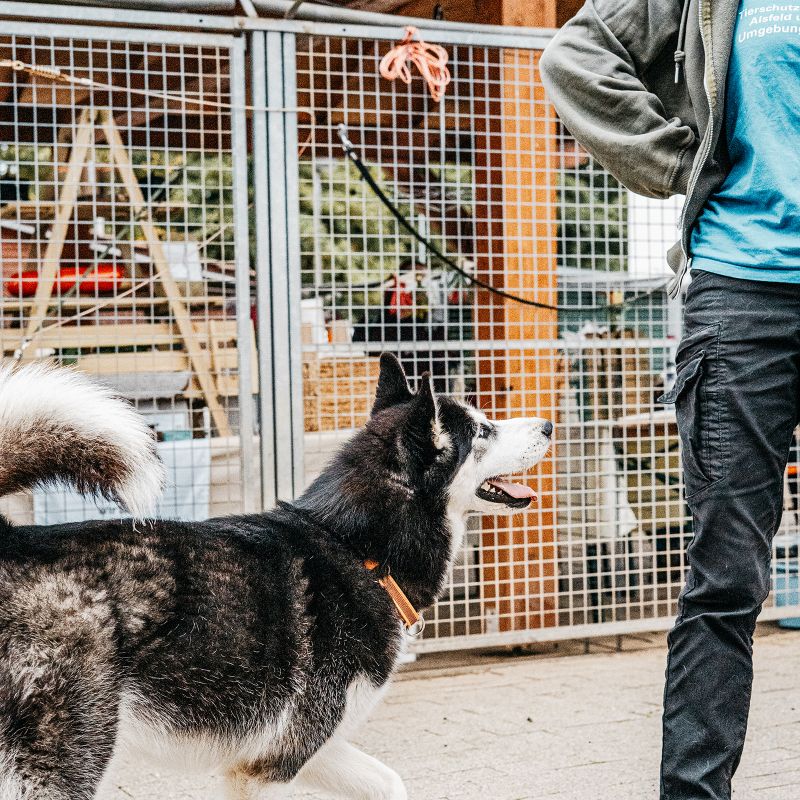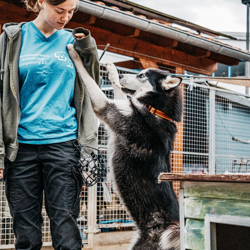 Anouk ist ein lebhafter und verspielter junger Husky. Er sprüht vor Energie und Lebensfreude. Dabei zeigt er sich oft übermütig und testet gerne seine und unsere Grenzen aus. Wir arbeiten intensiv daran, ihm liebevoll, aber konsequent zu zeigen, was erlaubt ist und was nicht. Er kennt bereits einige Grundkommandos und ist sehr lernwillig, vor allem wenn Futter im Spiel ist. Für Leckerlis macht Anouk fast alles. Man merkt ihm an, dass er arbeiten und gefordert werden möchte. Er möchte gefallen und sucht die Nähe zum Menschen. Mit anderen Hunden ist er nicht unverträglich, allerdings testet er auch hier gerne seine Grenzen aus. Er besucht regelmäßig unsere hausinterne Hundeschule und es wird dringend empfohlen, auch weiterhin eine Hundesschule mit ihm zu besuchen, da er sehr davon profitiert-sowohl im Gehorsam als auch im Sozialverhalten. Anouk liebt Wasser. Ob Bach, See oder Planschbecken, er springt mit Begeisterung hinein und tobt ausgelassen. Was er hingegen gar nicht mag ist das Anfassen von seinen Pfoten, aber auch da wird behutsam daran gearbeitet. Anouk ist an den Maulkorb gewöhnt und akzeptiert ihn problemlos. An der Leinenführigkeit wird ebenfalls fleißig geübt. Hier muss noch weiter daran gearbeitet werden.