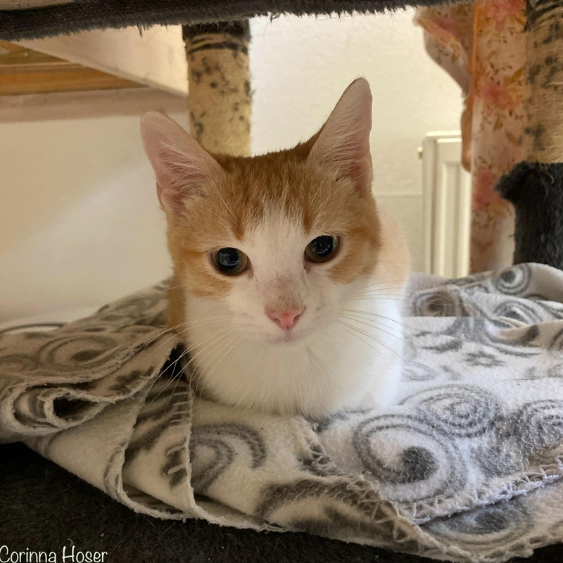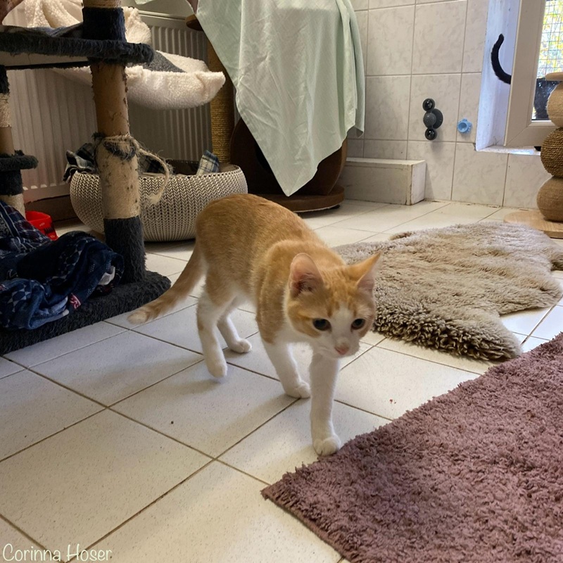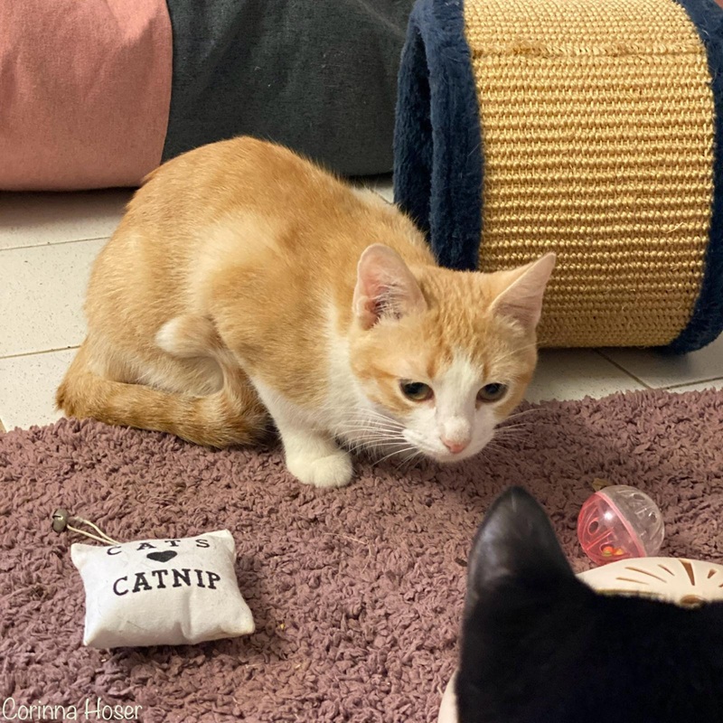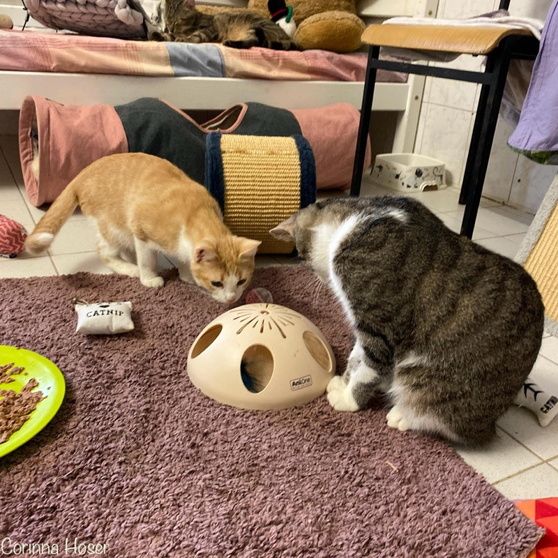 Der junge Kerl hat das aber alles super verkraftet und zeigt sie verspielt, interessiert und lieb bei uns im Katzenzimmer. Er hat sich zu einem Entdecker - Charakter entwickelt und braucht nicht mehr lange Zeit beim Vertrauensaufbau und der Kontaktaufnahme. Er ist aktiv im Zimmer unterwegs und schaut mit wem er raufen und spielen kann. Cubbi kabbelt sich gern mit Igthorn, Cavin oder auch Tammi. Mittlerweile hat sich aber eine enge Freundschaft zu Gruffi ergeben. Sie liegen zusammen, putzen sich und wo der Eine ist, ist auch der Andere. Es wäre toll, wenn beide gemeinsam ein Zuhause finden könnten.