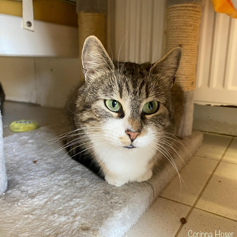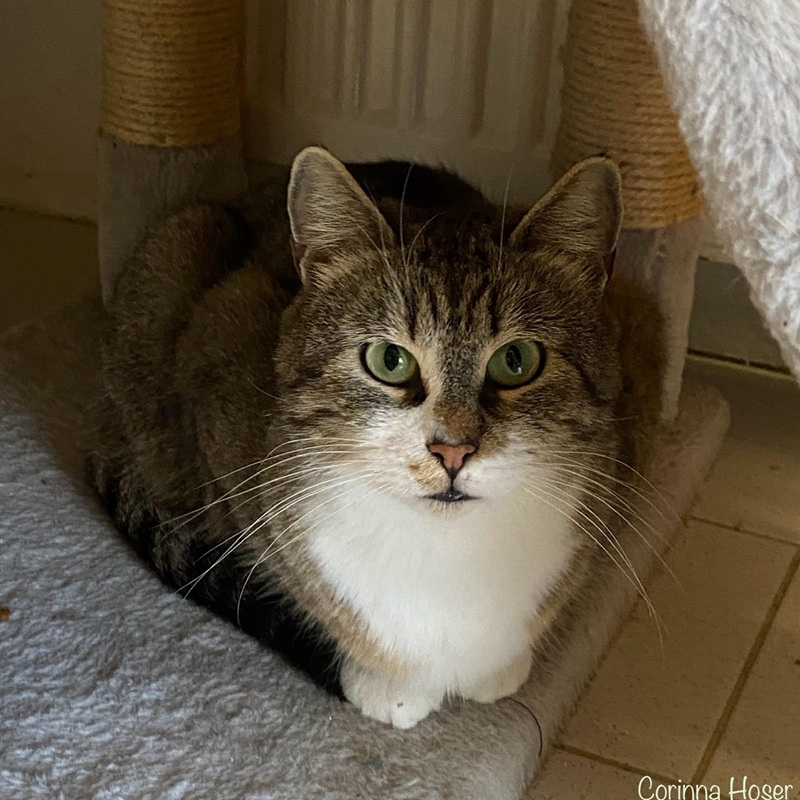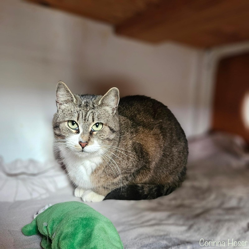 Die schöne Katzendame ist eine ruhige Vertreterin ihrer Art. Genauso wie Holly, bekommt man sie gar nicht so mit. Sie liegt in der Nähe und beobachtet den Menschen in sicherem Abstand. Man kann sich ihr auch nähern, aber streicheln - so dass sie es freiwillig macht und es auch genießt - war noch nicht möglich. In ihr steckt aber das Potential. Sie kann gern zu sozialen, netten Artgenossen ziehen, denn sie schätzt die Gesellschaft dieser. Oder mit ihr zieht eine Freundin aus. Hier beraten wir sie dann gerne.