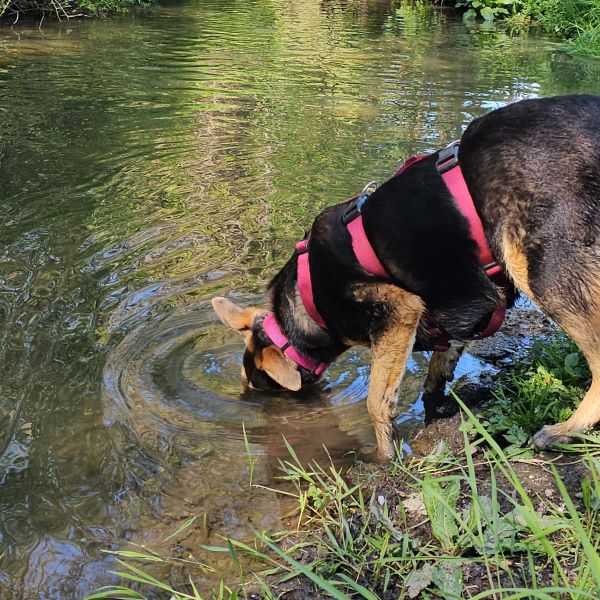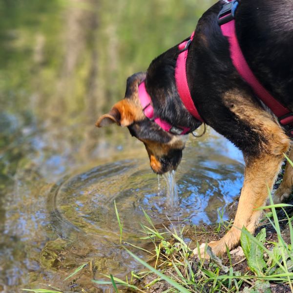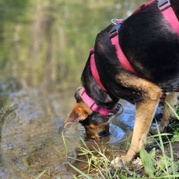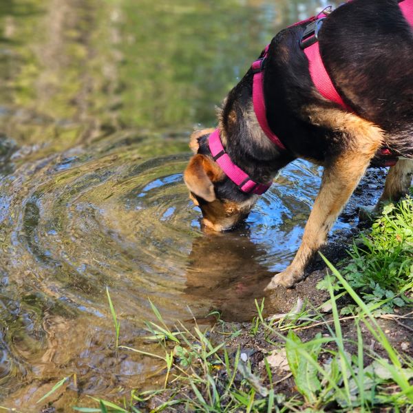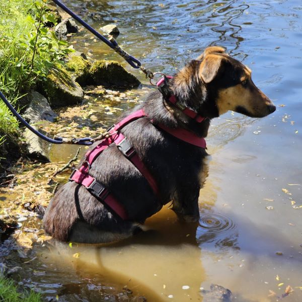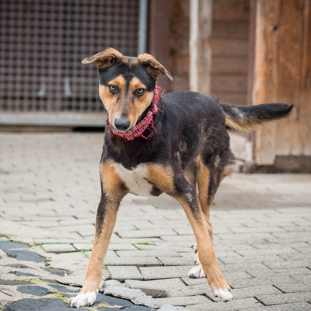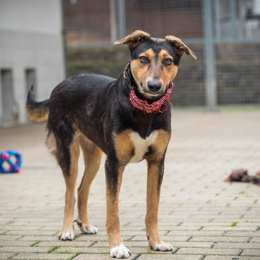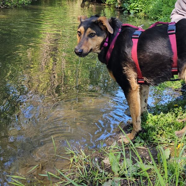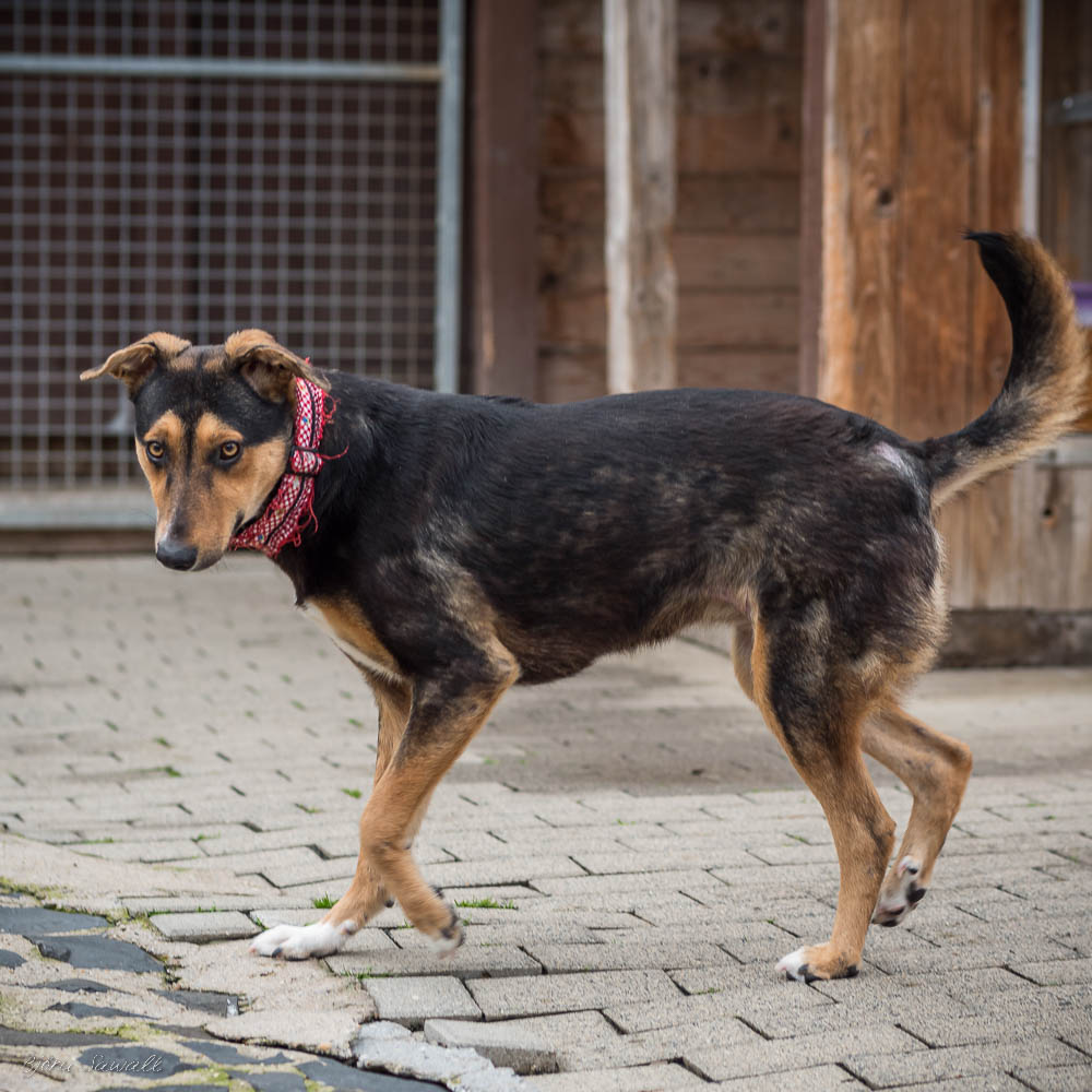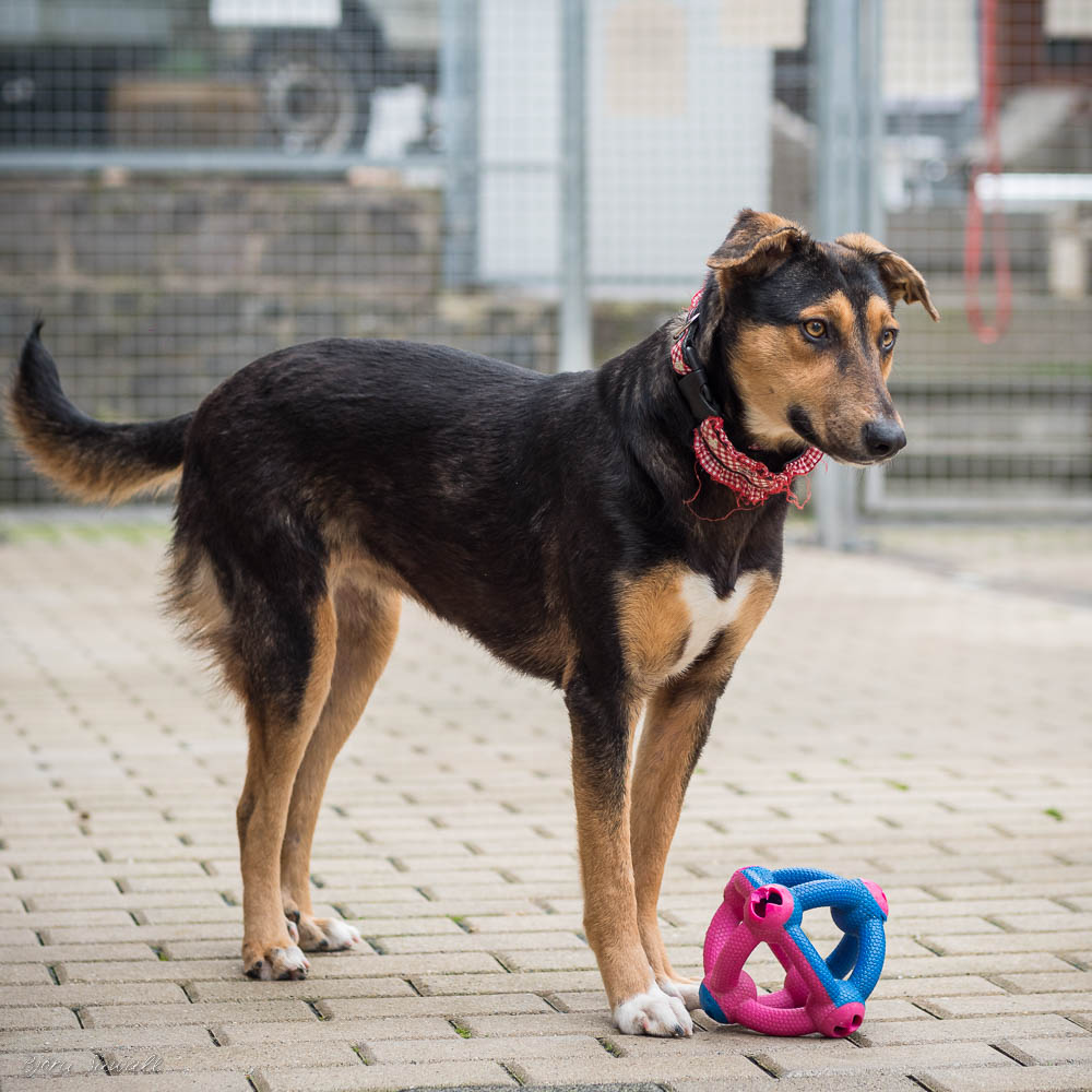 Auf uns Menschen geht sie aufgeschlossen und freundlich zu. Zudem hat sie immer gute Laune und genießt ihre Streicheleinheiten, die sie auch einfordert. Die ersten Spaziergänge um das Tierheim herum hat sie bereits schon unternommen. An der Leine gehen ist bei ihr allerdings noch etwas holprig. Sie geht nur bis zu einem bestimmten Punkt relativ gut mit, dann mag sie lieber ganz schnell wieder nach Hause ins Tierheim zurück. Bislang wissen wir noch nicht weshalb das so ist. Ob es vielleicht an der nahe gelegenen Zugunterführung liegt, können wir nur mutmaßen, denn bis vor den Tunnel läuft sie gut mit und dann möchte sie nicht mehr weitergehen. Hier üben wir gerade fleißig mit ihr.