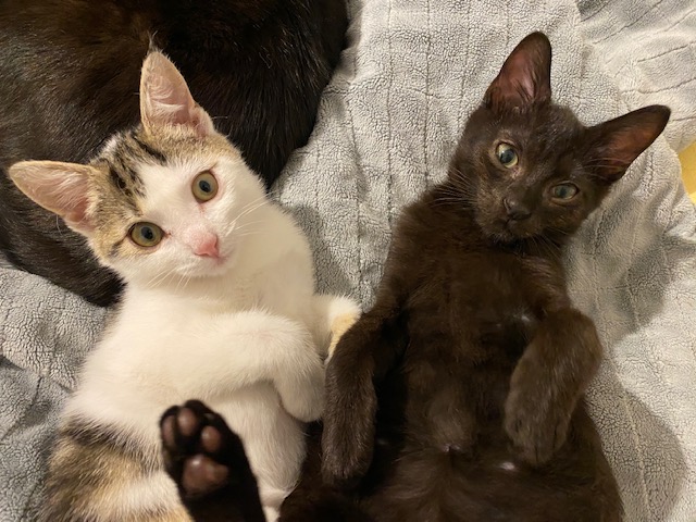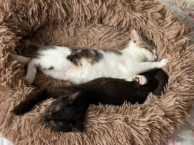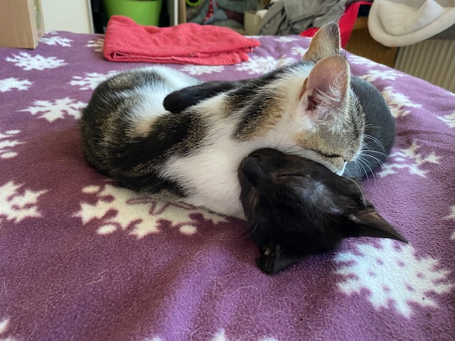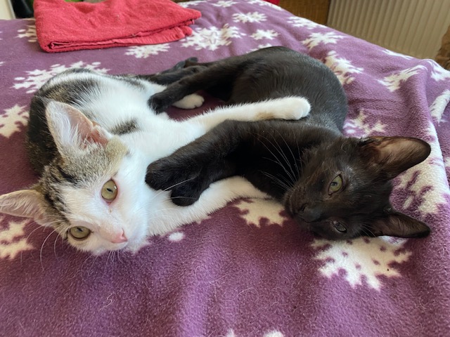 Barönchen und Sonnenscheinchen – hier sind die Namen Programm. Ein mittlerweile größerer schwarzer Kater, der glaubt ihm gehöre die Welt und eine quietschvergnügte Madame namens Sonnenscheinchen die ganz Prinzessin ist und wirklich die Sonne ins Herz zaubert. Beide lieben sich und können auch nicht ohne den Anderen. Ich als Pflegestellenmama könnte unendlich viele Geschichten über die Zwei erzählen. Beide lieben es wenn das Wasser läuft bzw. wo Wasser ist. Barönchen findet es leider auch interessant wenn das Klo offen ist, darauf sollte man bitte achten. Auch hat er eine Vorliebe gestrickte Sachen zu klauen und diese leider in die einzelnen Bestandteile zu zerlegen. Sie haben bei mir keine Einschränkungen. Sie dürfen einfach alles, so wie meine anderen Katzen auch. Sie kuscheln mit im Bett, dürfen überall hin oder hoch und genießen auch den Freisitz auf dem eingenetzten Balkon. Sie kuscheln, putzen, raufen und spielen unentwegt miteinander. Aber auch das sehr wilde Raufen gehört immer mit dazu. Das ist vollkommen normal und das brauchen sie auch! Barönchen hat keine Angst. Neugierig schaut er sich alles an, auch attackiert er im Spiel gern mal die Hand und die Zähnchen kommen zum Einsatz. So wie Katzenkinder eben sind. Bei mir gibt es Tür-Vorhänge und da spielt auch schon mal ein Sonnenscheinchen „Tarzan“ bzw. Jane.  Sie lieben (Blumen-)Erde und wenn man damit auch noch rumschießen kann – umso besser – hehe. Sie merken schon: Mit denen wird es einfach nicht langweilig. Sie sind bei mir im Rudel mit noch weiteren großen Katzen und akzeptieren die Grenzen, die ihnen gesetzt werden. Auch mit meiner Hündin leben sie gut zusammen und auch vor ihr haben sie respekt, denn den hat sie ihnen anerzogen. Ich könnte ewig weitererzählen. Leider ist ihre Gesundheit nicht 100% ok. Sie haben Katzenschnupfen und nießen auch noch viel. Bei Barönchen ist es besser geworden, bei Sonnenscheinchen bleibt es so. Man muss eben damit leben, dass man an den Wänden kleine grüne "Niesser" findet. Das ist nunmal so bei Katzenschnupf-Patienten.