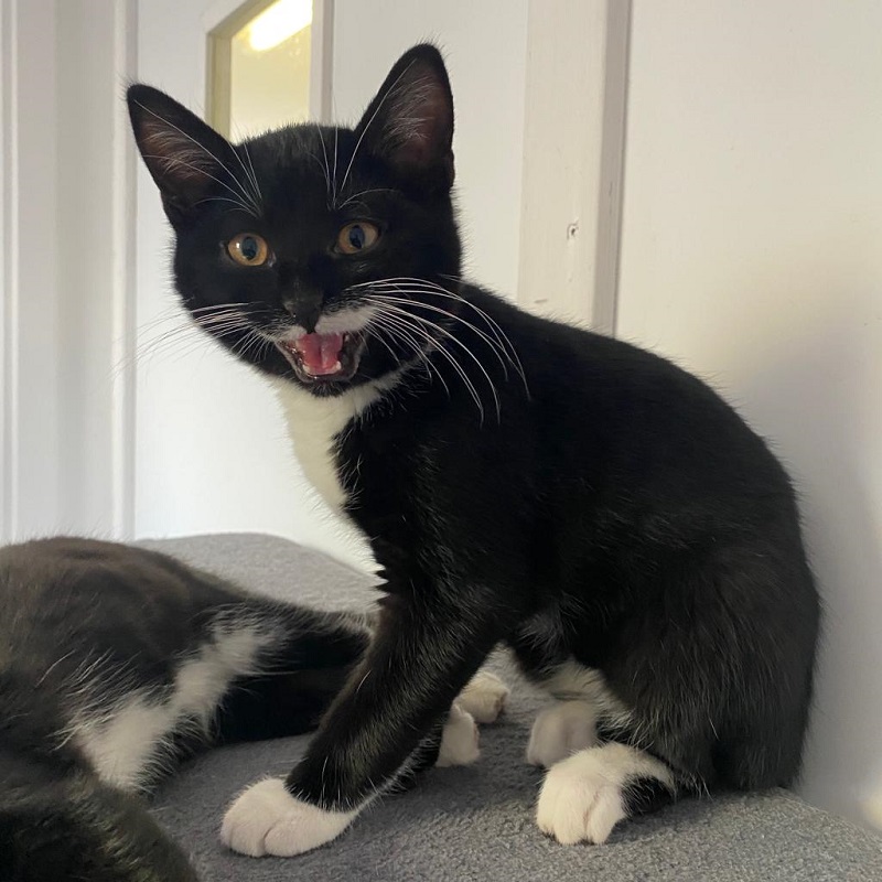 Bonny und Clyde haben wir vom Tierheim Marburg übernommen, da sie an ihre Aufnahmekapazität gekommen sind. Die beiden Katzenkinder wurden in Breidenbach gefunden. Anfangs waren sie sehr ängstlich und abweisend gegenüber dem Menschen. Durch intensive Betreuung unserer Tierärztin wurden sie ab dem 3. Tag zutraulich und haben angefangen zu spielen und zu schnurren. Bonny ist die Mutigere von den beiden. Clyde redet gern und viel. Es war fast unmöglich Bilder von ihm zu machen, auf denen er nicht miaut. Die beiden sind ein wundervolles Dreamteam und werden auch nur gemeinsam vermittelt. Mit ihnen holt man sich die Freude ins Haus. Zu schön ist es, kleine Katzenkinder beim Aufwachsen zuzusehen.