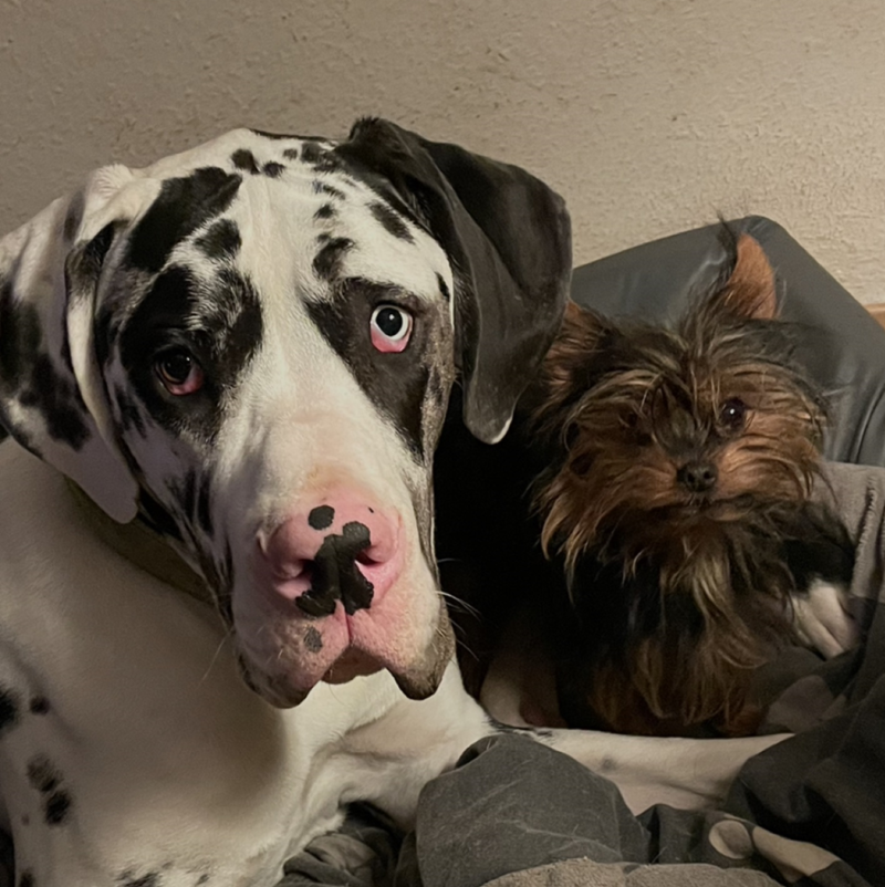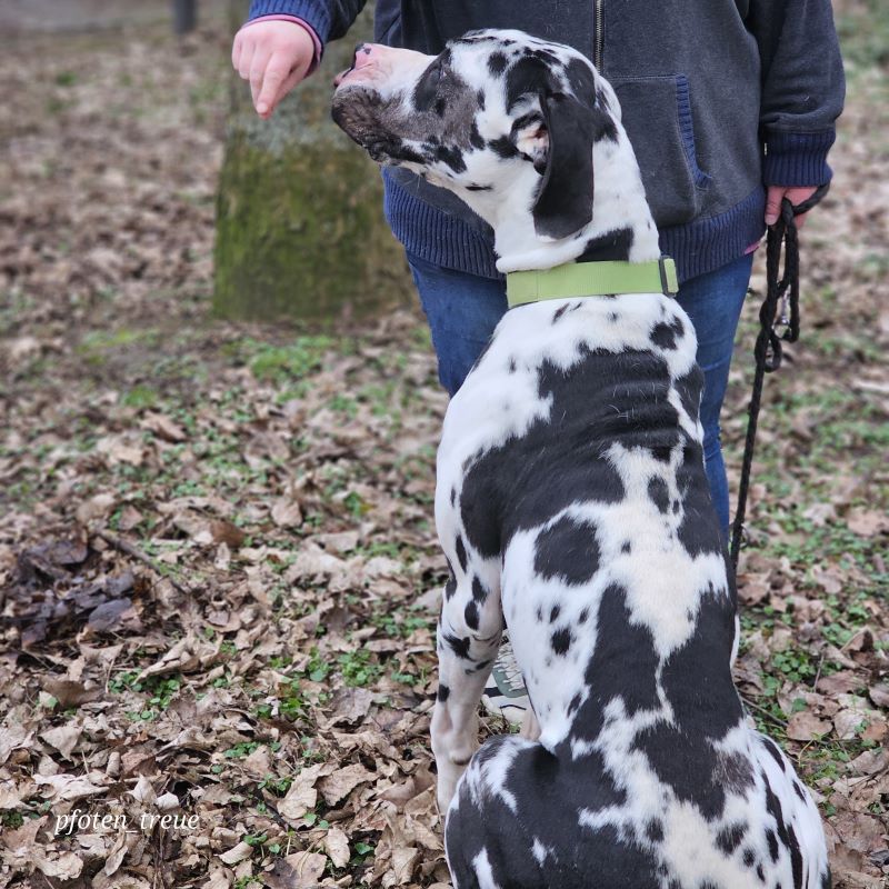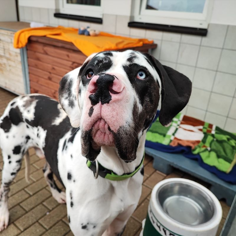 Seine ehemaligen Besitzer beschreiben ihn wie folgt: Ole ist eine Harlekin Dogge und 1,5 Jahre alt. Er ist agil und kennt alle Grundkommandos gut. Er bleibt alleine und fährt auch gerne Auto. Draußen ist er gut händelbar und abrufbar. Ole versteht sich mit anderen Hunden. Nur beim Fressen sollte darauf geachtet werden, dass von anderen Tieren getrennt gefüttert wird, da er sehr verfressen ist. Ole versteht sich ansonten gut mit anderen Hunden und kennt im Außenbereich Katzen und Pferde. Er hat einen blauen Heimtierausweis und ist gechippt. Vor vier Wochen war die letzte Wurmkur. Ole ist nicht kastriert. Ole ist bislang noch etwas stürmisch und eine Hundeschule macht auf jeden Fall Sinn. Der neue Besitzer sollte sich nach Möglichkeit auch mit der Rasse auskennen.