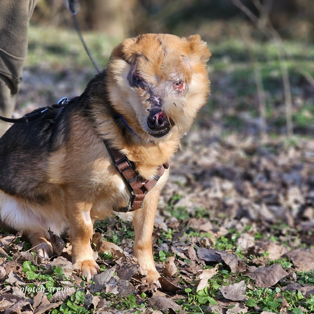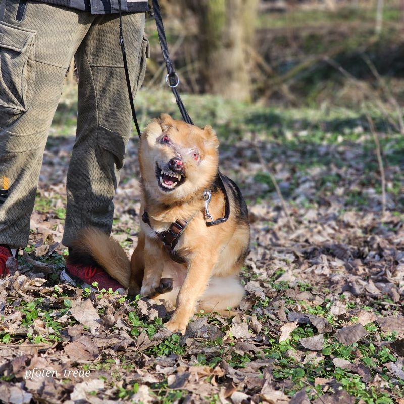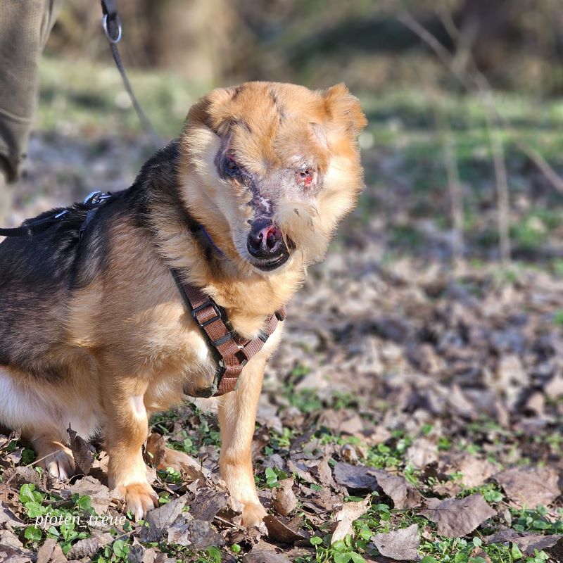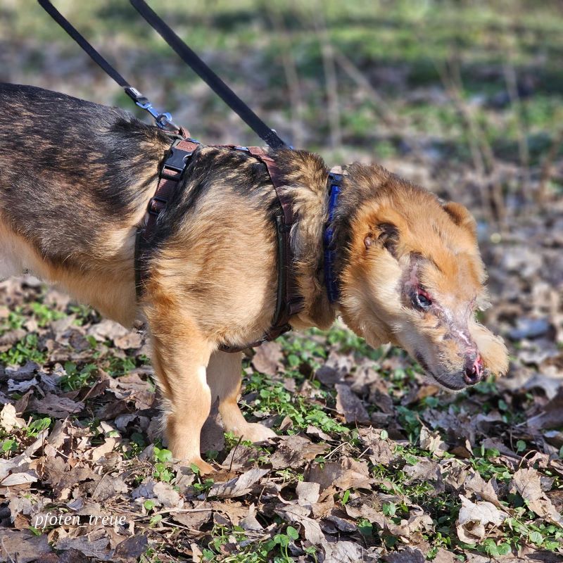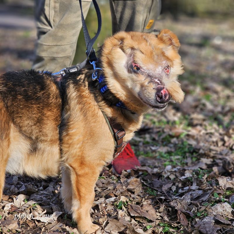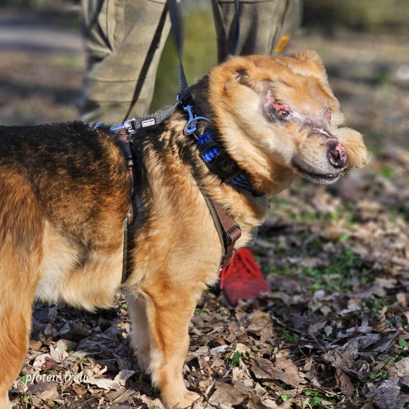 Aber August liebt sein Leben und freut sich so sehr über Zuwendung und Streicheleinheiten. Er hat bei uns auch schon eine Hundefreundin und geht prima Spazieren.