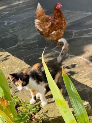 Unser junges Ataxie-Kätzchen namens Knisterchen ist ein absolut verschmuster und anhänglicher Sonnenschein. Sie kann gar nicht eng genug beim Menschen sein, auf Schritt und Tritt folgt sie ihrem Pflegefrauchen und liebt auch die Hunde im Haus. Das gemeinsame Schmusen, aber auch sogar das gemeinsame Naschen aus einem Napf ist für Knisterchen und auch für die große Hündin eine Wonne.
