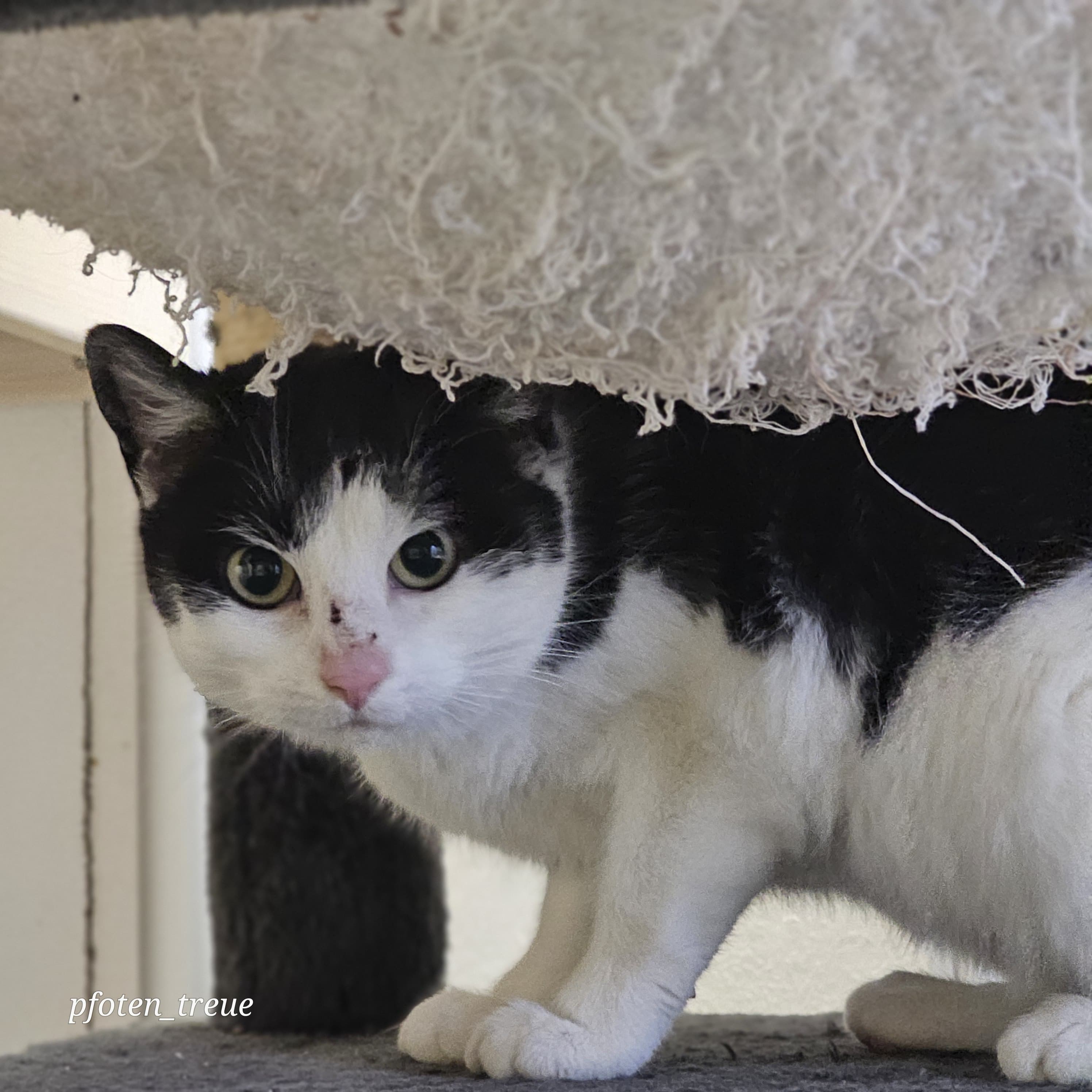 Noch sitzt sie beim Bespaßen und Spielen der anderen Katzen abseits, ist aber durchaus interessiert. Wobei es nicht so wirkt, als würde sie eine Spielangel oder generell Spielzeug kennen.