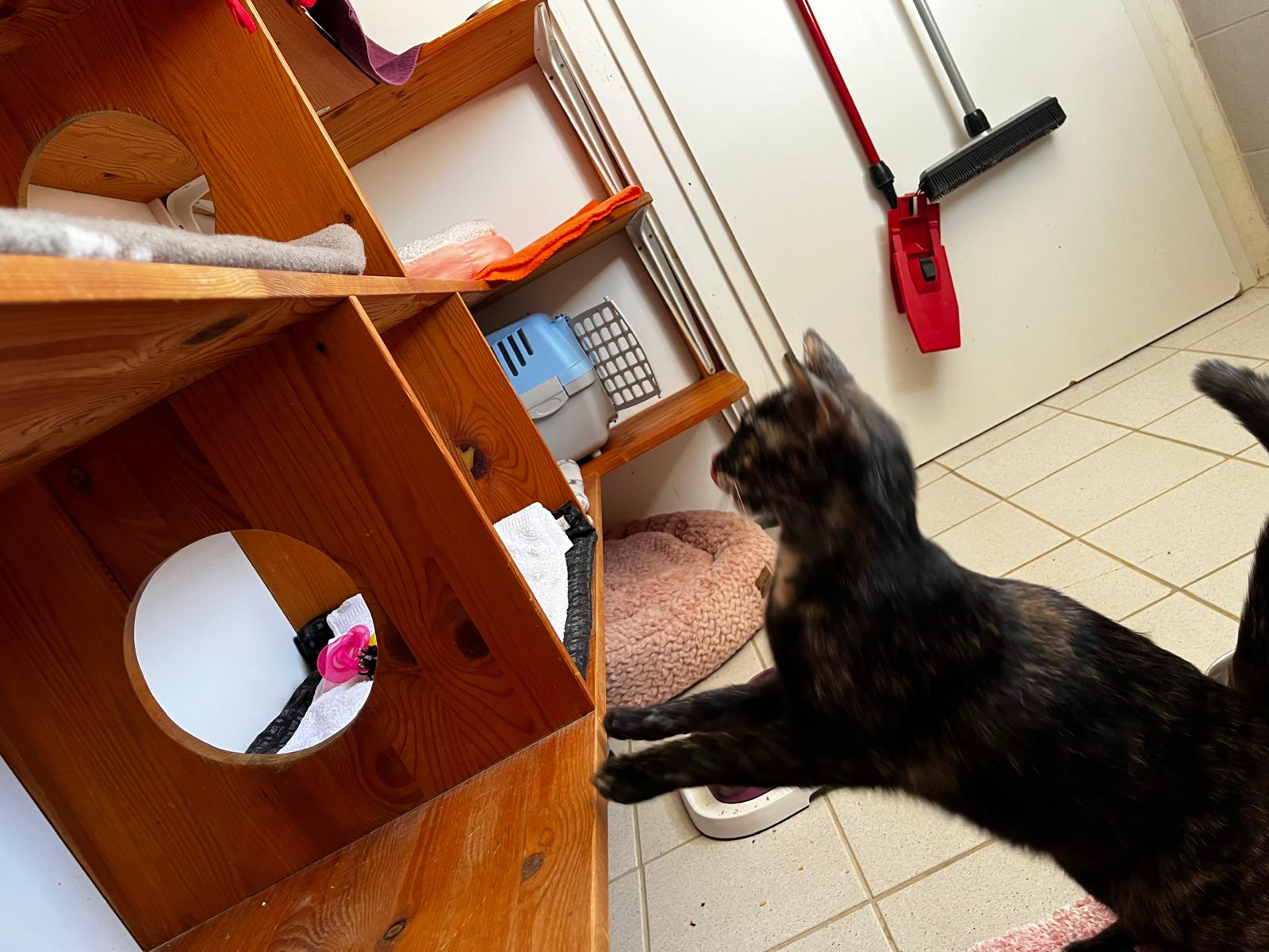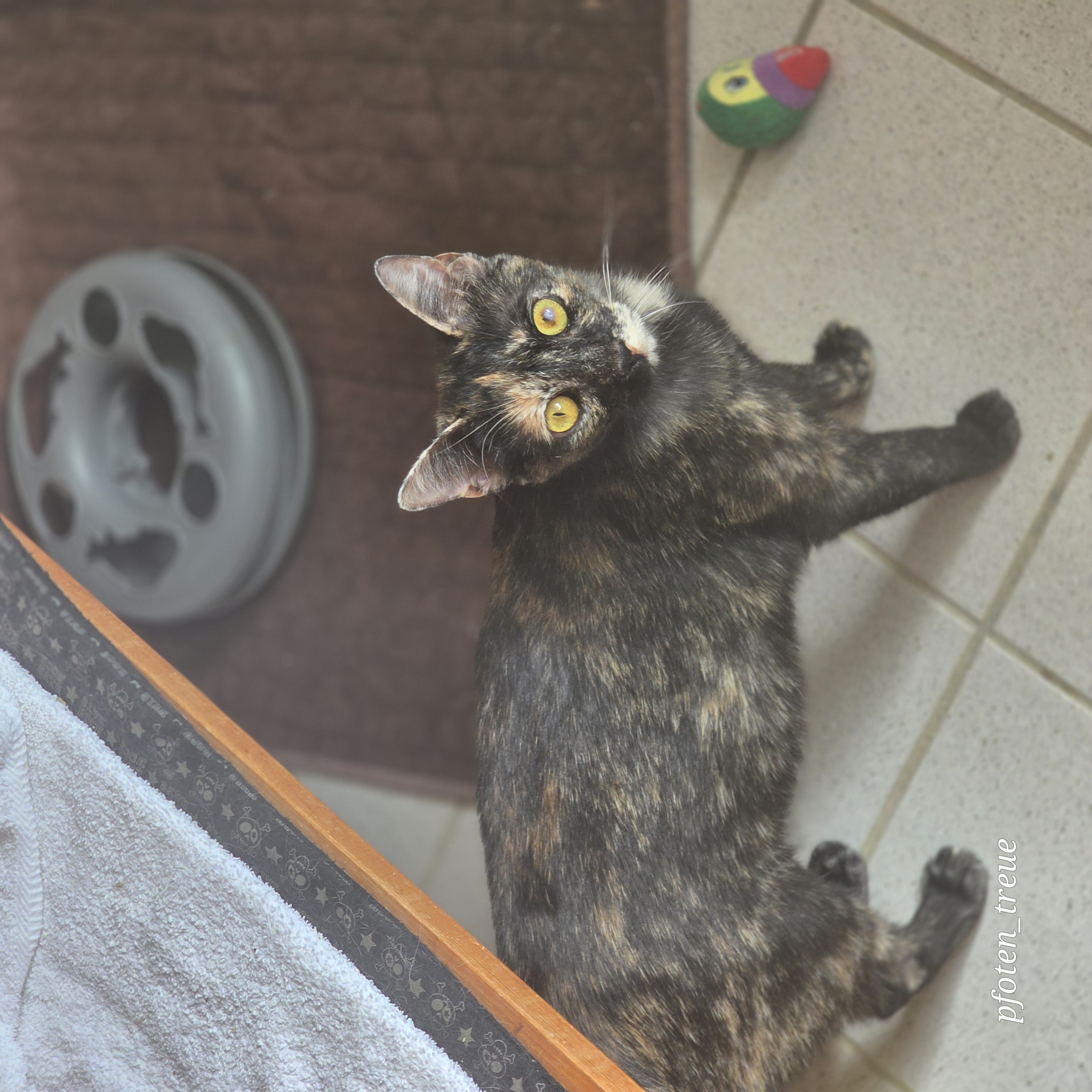 Das wunderschöne Schildpatt-Mädchen ist sehr aktiv und von daher immer bereit für Spielchen. Bei ihr können wir uns ein lebhaftes Zuhause gut vorstellen.