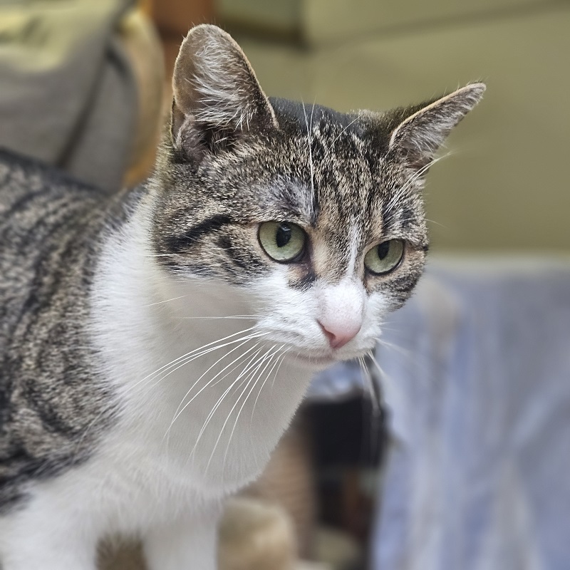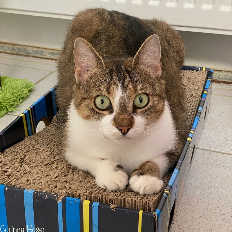 Bounty schaut einen mit ihren grossen, wunderschönen Kulleraugen an. Sie ist in allem absolut unkompliziert und auch ein kleines Plappermäulchen. Wenn ihre Schwester maunzt oder eben ihre Unsicherheit zeigt, ist Bounty direkt zur Stelle und schaut ob bei ihrer Schwester alles gut ist.