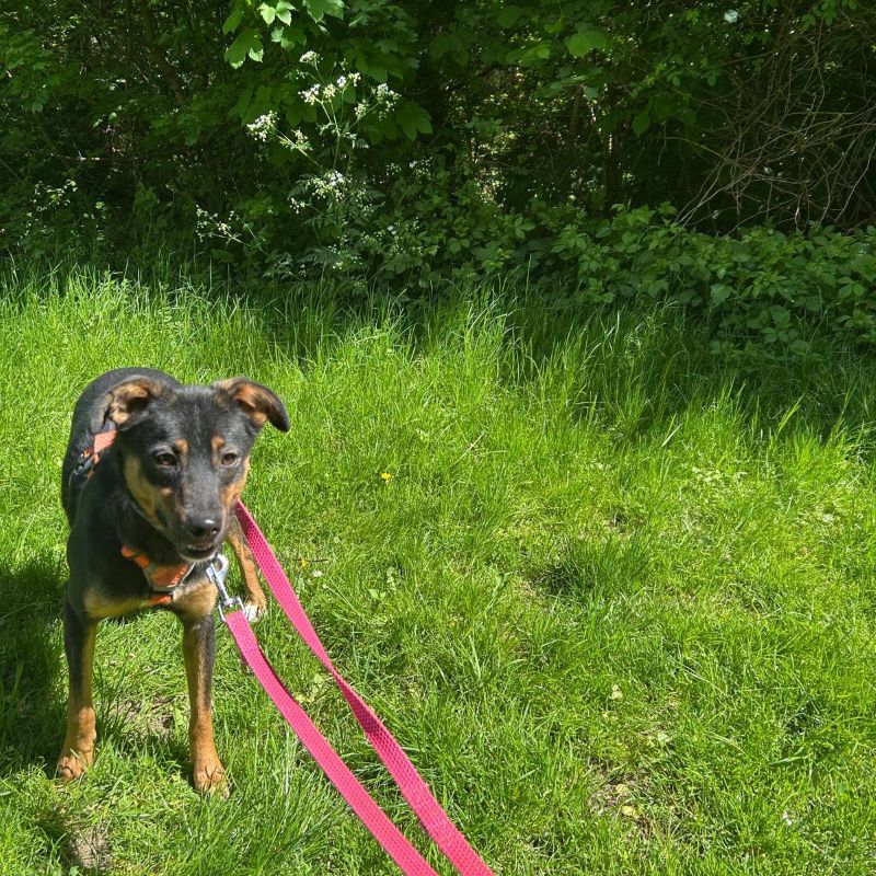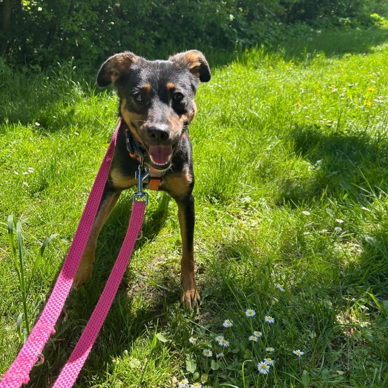 Neuem gegenüber ist sie erst einmal skeptisch und vorsichtig, aber auch neugierig. Sie möchte gerne alles richtig machen und versucht sich gut an ihrem Menschen zu orientieren. Gleiche Abläufe und Routinen geben ihr Sicherheit. Vor unbekannten Geräuschen hat sie Angst, woran wir gerade arbeiten.