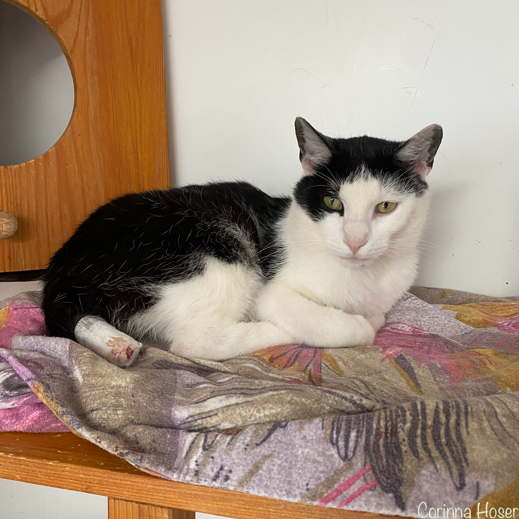 Zu den Menschen ist Robert auch sehr freundlich. Er lässt sich streicheln, wenn er möchte, ansonsten geht er einfach und macht sein Ding. Die Wunde am Schwanz lässt er auch gut behandeln. Leckerlies nimmt er sehr gern an, man muss nur aufpassen, denn er hat ein großes Mäulchen und wenn die Leckerlies zu klein sind, dann kann es eben passieren, dass die Finger mit drin sind. Aber er beißt jetzt nicht fest zu. An sich ist er ein toller großer, stattlicher Kater.