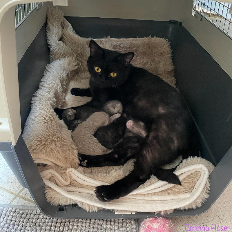 Baggy wurde uns trächtig übergeben, da die Situation der Halterin schwierig war. Mit ihr zog auch ihr erwachsener Sohn Leo ins Tierheim ein (dieser hat auch schon ein Zuhause gefunden). Leo hatte Baggy bereits zum 5. Mal gedeckt und so wussten wir, dass die Kitten in Baggys Bauch leider aus Inzucht entstanden sind.