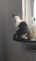 Mogli ist zutraulich, er miaut viel und schmust gerne. Er hat einen grauen Fleck im Gesicht.