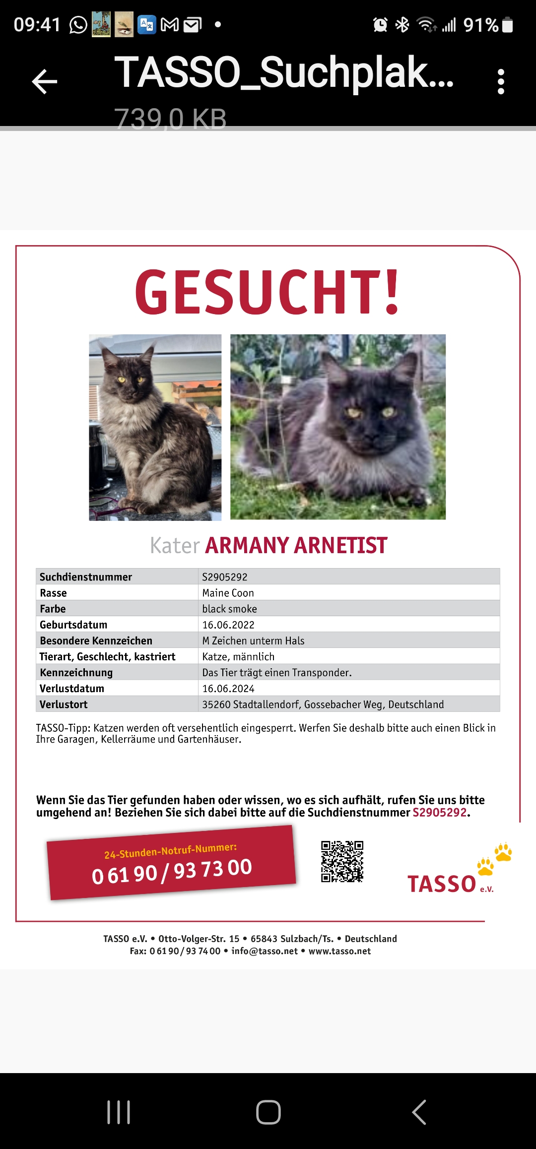 Das Tier wird vermisst seit (Datum/Uhrzeit): : 16.6.24 seit früh